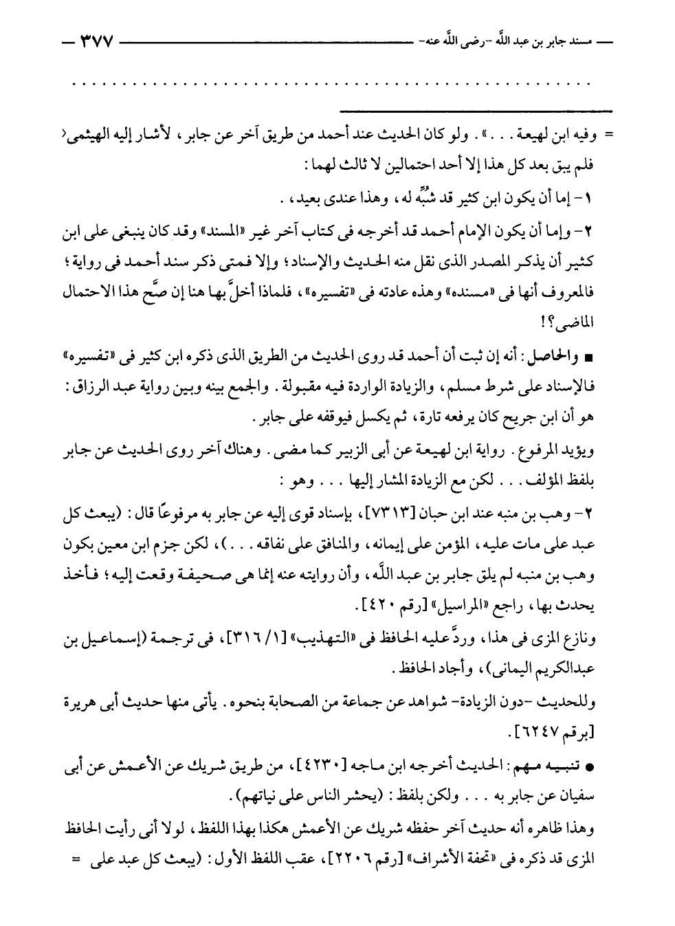 * والحاصل: أنه إن ثبت أن أحمد قد روى الحديث من الطريق الذي ذكره ابن كثير في "تفسيره" فالإسناد على شرط مسلم، والزيادة الواردة فيه مقبولة. والجمع بينه وبين رواية عبد الرزاق: هو أن ابن جريح كان يرفعه تارة، ثم يكسل فيوقفه على جابر.