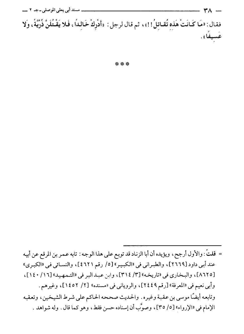 = قلتُ: والأول أرجح، ويؤيده أن أبا الزناد قد توبع على هذا الوجه: تابه عمر بن المرقع عن أبيه عند أبى داود [٢٦٦٩]، والطبرانى في "الكبير" [٥/ رقم ٤٦٢١]، والنسائى في "الكبرى" [٨٦٢٥]، والبخارى في "تاريخه" [٣/ ٣١٤]، وابن عبد البر في "التمهيد" [١٦/ ١٤٠]، وأبى نعيم في "المعرفة" [رقم ٢٤٤٩]، والرويانى في "مسنده" [٢/ ١٤٥٢]، وغيرهم.