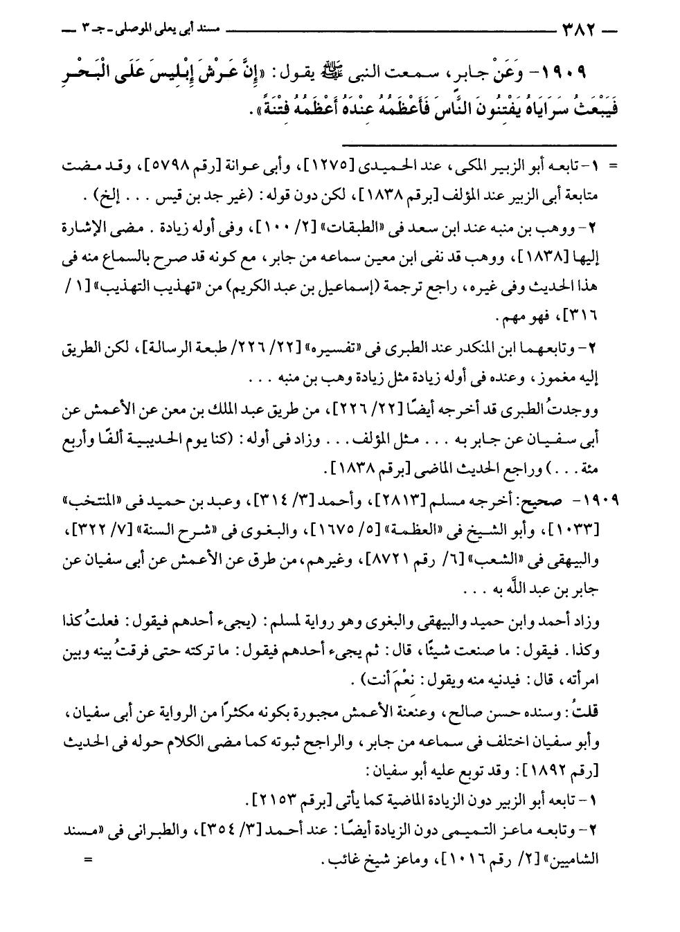 قلتُ: وسنده حسن صالح، وعنعنة الأعمش مجبورة بكونه مكثرًا من الرواية عن أبى سفيان، وأبو سفيان اختلف في سماعه من جابر، والراجح ثبوته كما مضى الكلام حوله في الحديث [رقم ١٨٩٢]: وقد توبع عليه أبو سفيان: