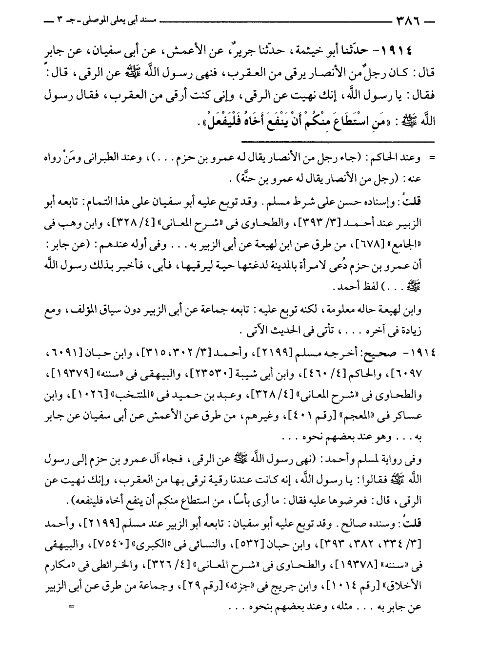 ١٩١٤ - حَدَّثَنَا أبو خيثمة، حَدَّثَنَا جريرٌ، عن الأعمش، عن أبى سفيان، عن جابر قال: كان رجلٌ من الأنصار يرقى من العقرب، فنهى رسول الله - صلى الله عليه وسلم - عن الرقى، قال: فقال: يا رسول الله، إنك نهيت عن الرقى، وإنى كنت أرقى من العقرب، فقال رسول الله - صلى الله عليه وسلم -: "مَنِ اسْتَطَاعَ مِنْكُمْ أَنْ يَنْفَعَ أَخَاهُ فَلْيَفْعَلْ".