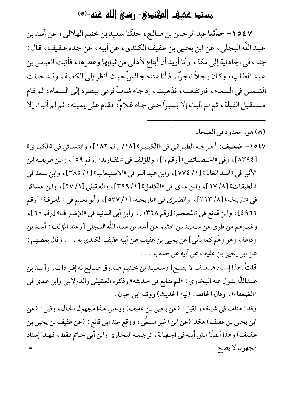 ١٥٤٧ - ضعيف: أخرجه الطبرانى في "الكبير" [١٨/ رقم ١٨٢]، والنسائى في "الكبرى" [٨٣٩٤]، وفى "الخصائص" [رقم ٦]، والمؤلف في "المفاريد" [رقم ٥٩]، ومن طريقه ابن الأثير في "أسد الغابة" [١/ ٧٧٤]، وابن عبد البر في "الاستيعاب" [١/ ٣٨٥]، وابن سعد في "الطبقات" [٨/ ١٧]، وابن عدى في "الكامل" [١/ ٣٩٩]، والعقيلى [١/ ٢٧]، وابن عساكر في "تاريخه" [٨/ ٣١٣]، والطبرى في "تاريخه" [١/ ٥٣٧]، وأبو نعيم في "المعرفة" [رقم ٤٩٦٦]، وابن قانع في "المعجم" [رقم ١٣٢٨]، وابن أبى الدنيا في "الإشراف" [رقم ٦٠]، وغيرهم من طرق عن سعيد بن خثيم عن أسد بن عبد الله البجلى [وعند المؤلف: أسد بن وداعة، وهو وهْم كما يأتى] عن يحيى بن عفيف عن أبيه عفيف الكندى به ... وقال بعضهم: عن ابن يحيى بن عفيف عن أبيه عن جده به ...