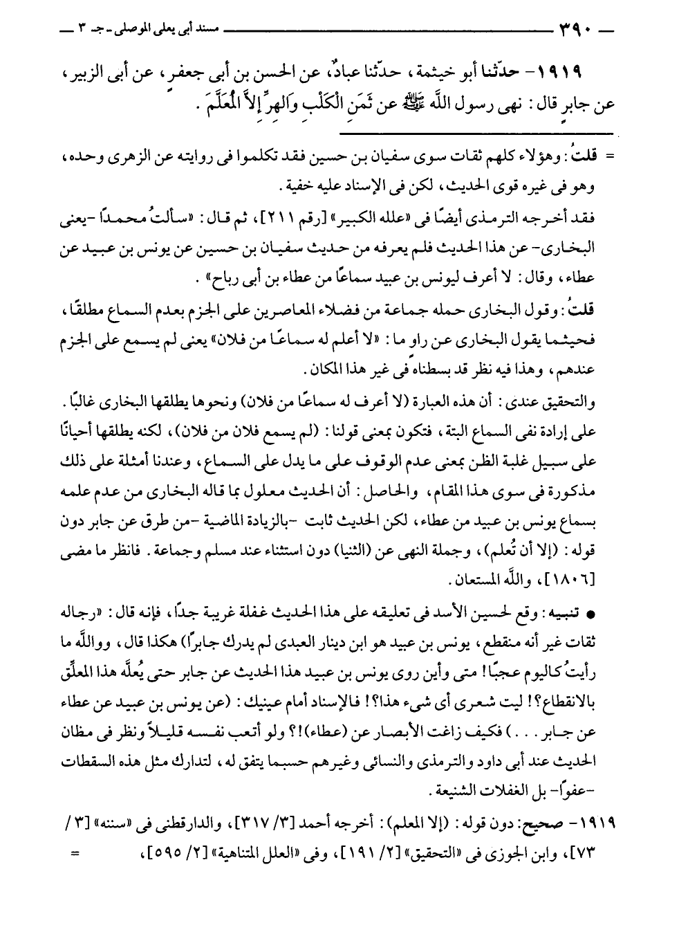 • تنبيه: وقع لحسين الأسد في تعليقه على هذا الحديث غفلة غريبة جدًّا، فإنه قال: "رجاله ثقات غير أنه منقطع، يونس بن عبيد هو ابن دينار العبدى لم يدرك جابرًا) هكذا قال، وواللَّه ما رأيتُ كاليوم عجبًا! متى وأين روى يونس بن عبيد هذا الحديث عن جابر حتى يُعلَّه هذا المعلَّق بالانقطاع؟! ليت شعرى أي شئ هذا؟! فالإسناد أمام عينيك: (عن يونس بن عبيد عن عطاء عن جابر ... ) فكيف زاغت الأبصار عن (عطاء)!؟ ولو أتعب نفسه قليلًا ونظر في مظان الحديث عند أبى داود والترمذى والنسائى وغيرهم حسبما يتفق له، لتدارك مثل هذه السقطات - عفوًا - بل الغفلات الشنيعة.