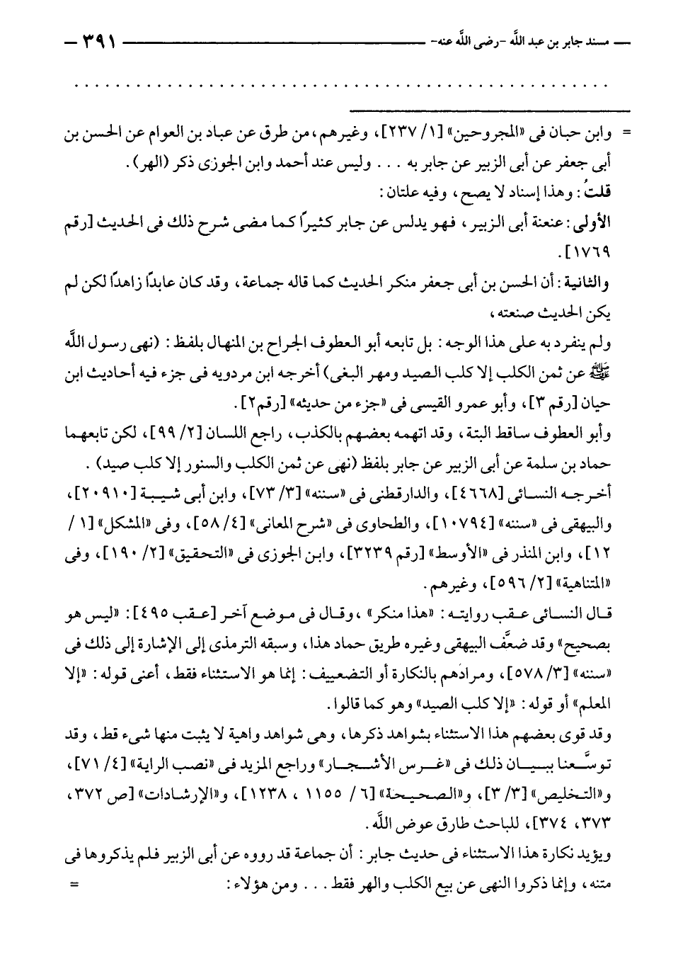 ويؤيد نكارة هذا الاستثناء في حديث جابر: أن جماعة قد رووه عن أبى الزُّبَير فلم يذكروها في متنه، وإنما ذكروا النهى عن بيع الكلب والهر فقط ... ومن هؤلاء: =