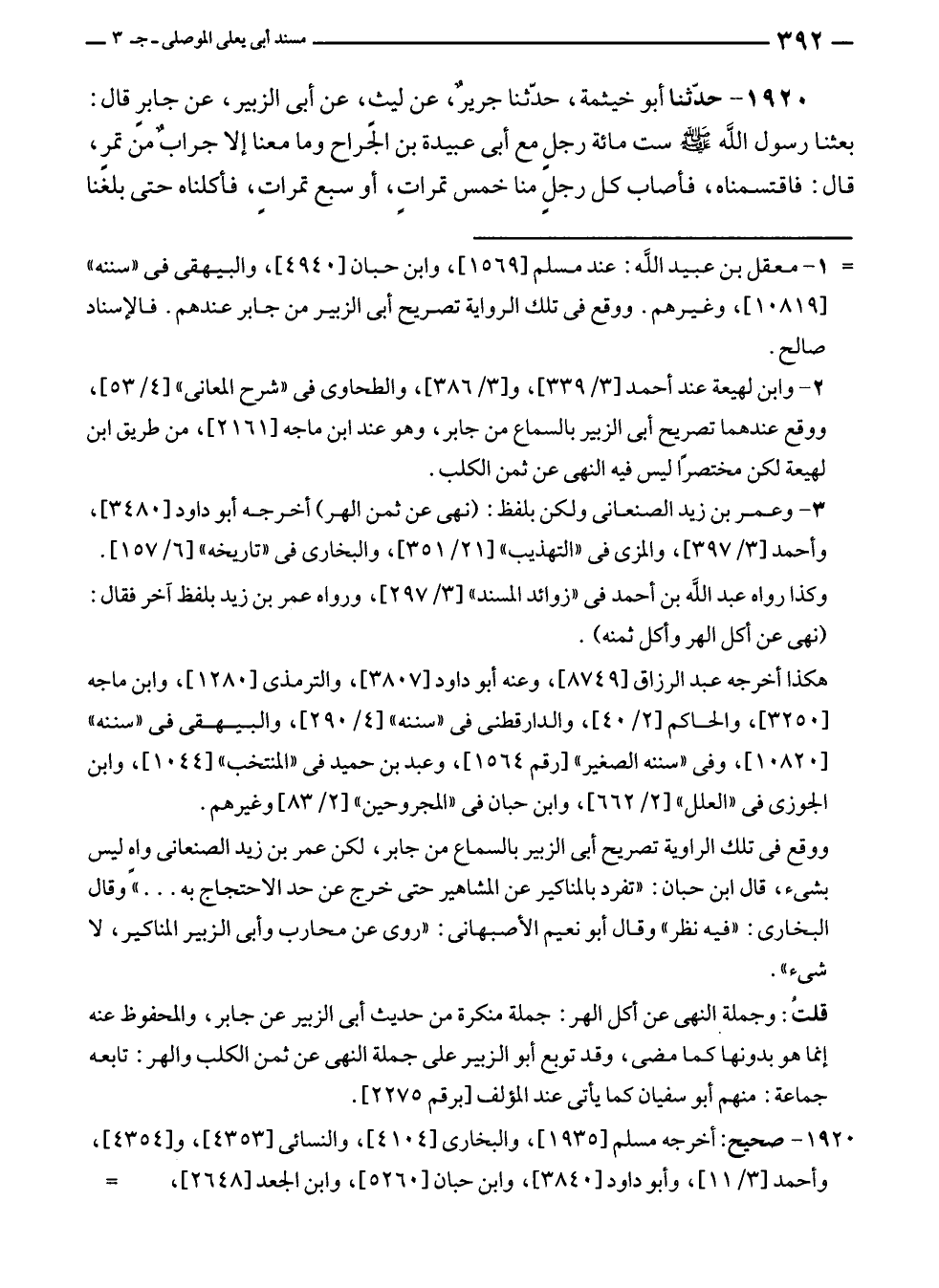 = ١ - معقل بن عبيد الله: عند مسلم [١٥٦٩]، وابن حبان [٤٩٤٠]، والبيهقيّ في "سننه" [١٠٨١٩]، وغيرهم. ووقع في تلك الرواية تصريح أبى الزُّبَير من جابر عندهم. فالإسناد صالح.