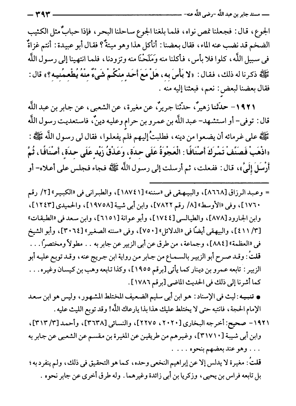 ١٩٢١ - صحيح: أخرجه البخارى [٢٠٢٠، ٢٢٧٥]، والنسائى [٣٦٣٨]، وأحمد [٣/ ٣١٣]، وابن أبى شيبة [٣١٧١٠]، وغيرهم من طريقين عن المغيرة بن مقسم عن الشعبى عن جابر به ... وهو عند بعضهم بنحوه ...