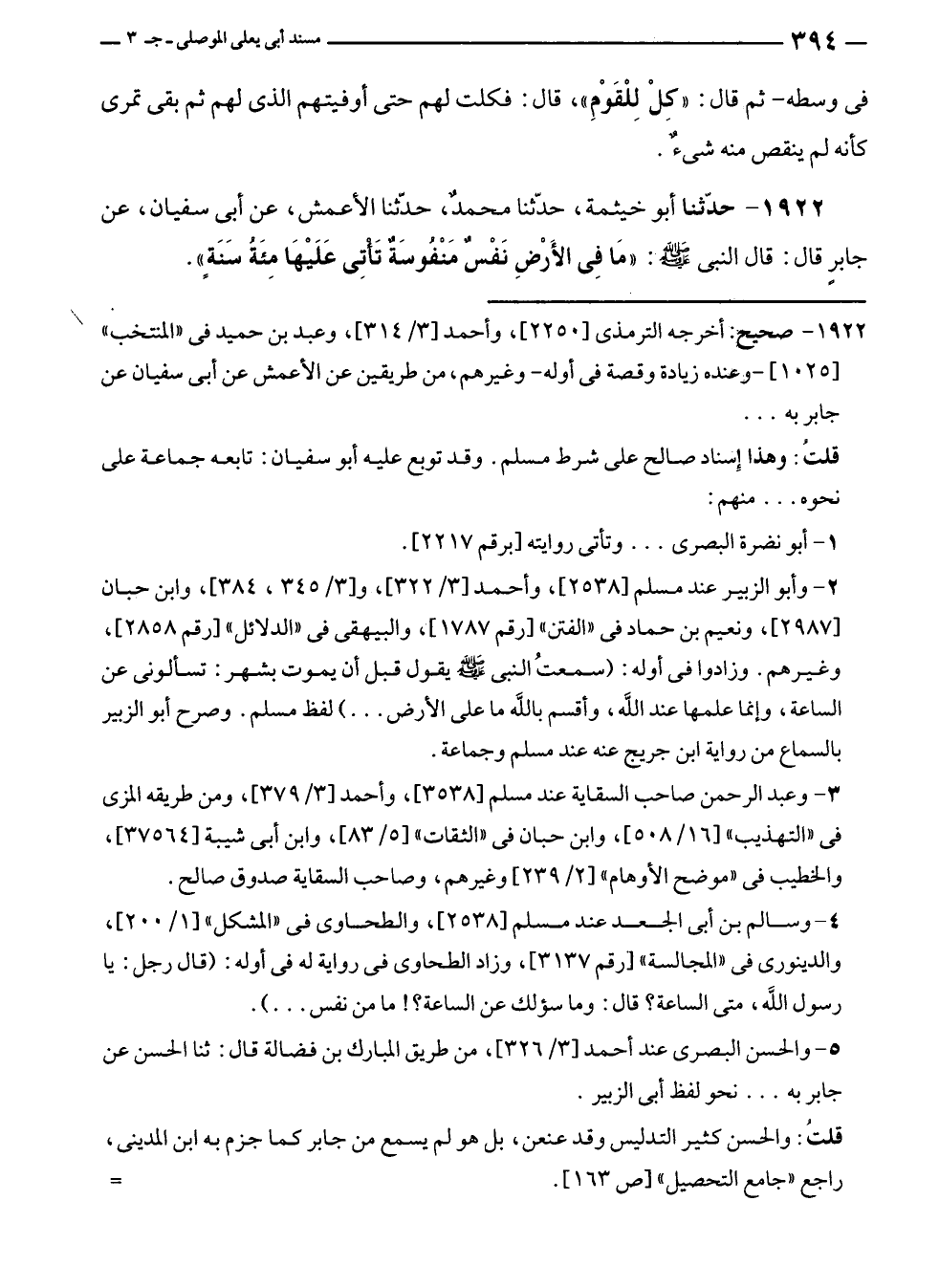 ١٩٢٢ - حَدَّثَنَا أبو خيثمة، حَدَّثَنَا محمّد، حَدَّثَنَا الأعمش، عن أبى سفيان، عن جابر قال: قال النَّبِيّ - صلى الله عليه وسلم -: "مَا فِي الأَرْضِ نَفْسٌ مَنْفُوسَة تَأْتِى عَلَيْهَا مِئَةُ سَنَةٍ".