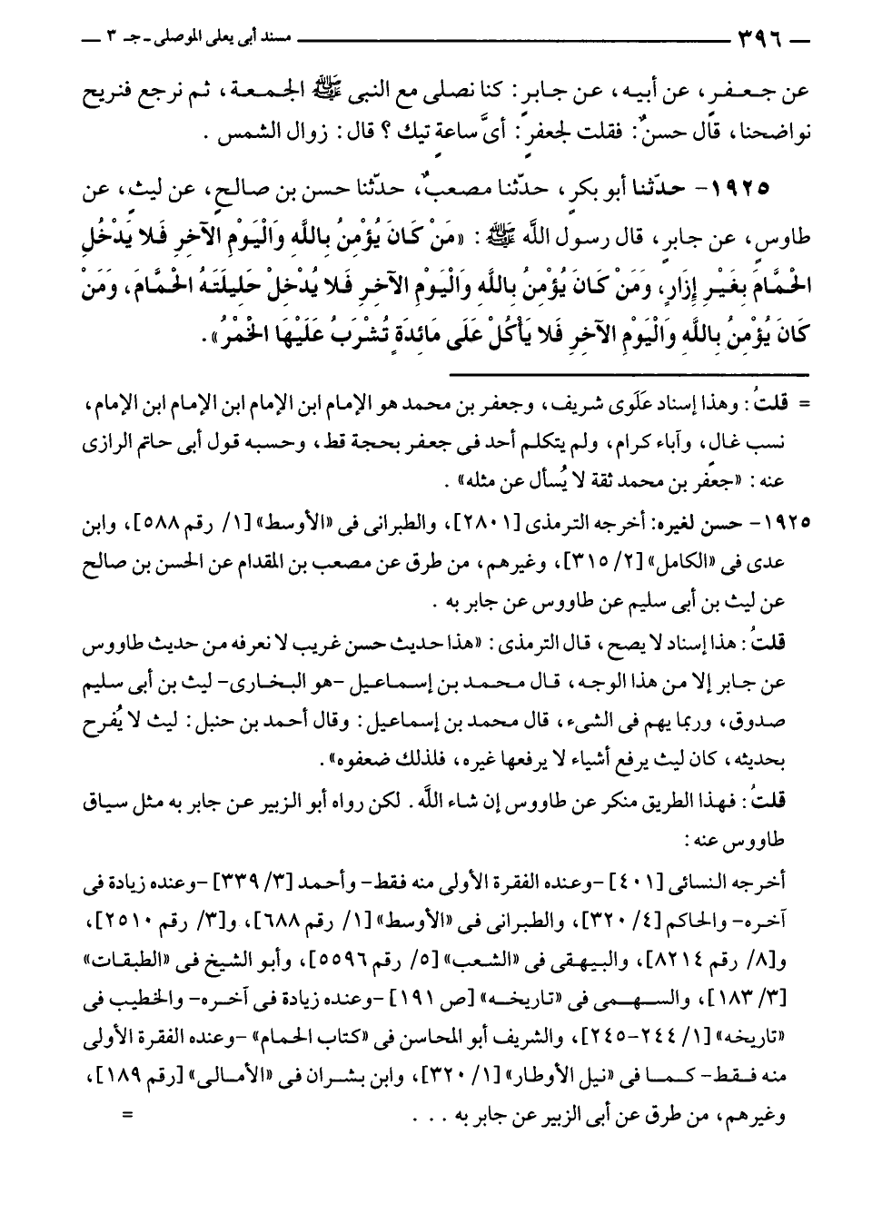 قلتُ: هذا إسناد لا يصحّ، قال الترمذى: "هذا حديث حسن غريب لا نعرفه من حديث طاووس عن جابر إِلَّا من هذا الوجه، قال محمّد بن إسماعيل - هو البخارى - ليث بن أبى سليم صدوق، وربما يهم فى الشئ، قال محمّد بن إسماعيل: وقال أحمد بن حنل: ليث لا يُفرح بحديثه، كان ليث يرفع أشياء لا يرفعها غيره، فلذلك ضعفوه".
