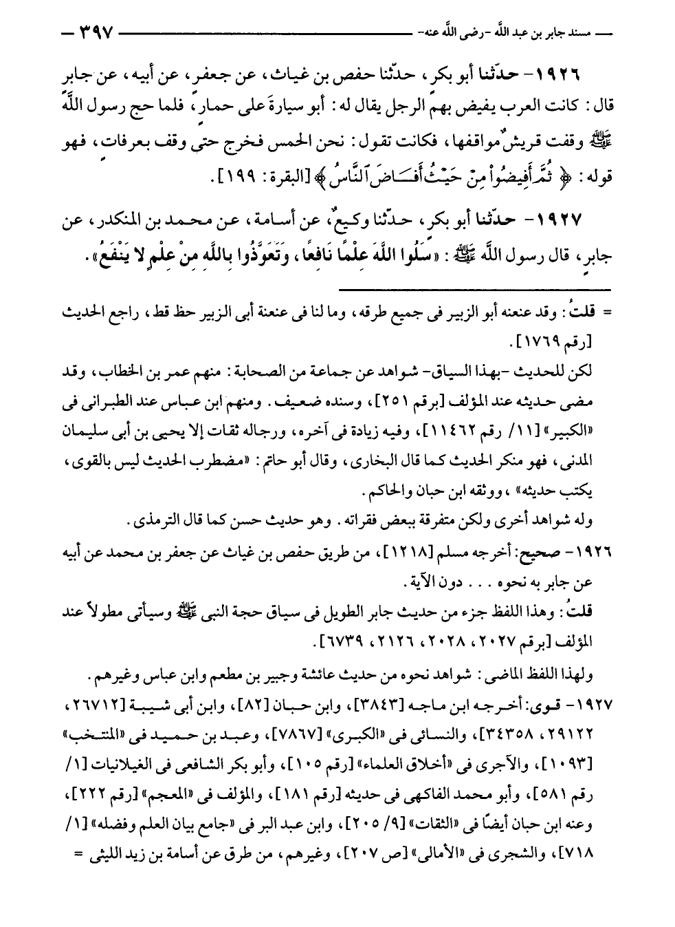١٩٢٧ - حدّثنا أبو بكرٍ، حَدَّثَنَا وكيعٌ، عن أسامة، عن محمّد بن المنكدر، عن جابرٍ، قال رسول الله - صلى الله عليه وسلم -: "سَلُوا اللَّهَ عِلْمًا نَافِعًا، وَتَعَوَّذُوا بِاللهِ مِنْ عِلْمٍ لا يَنْفَعُ".