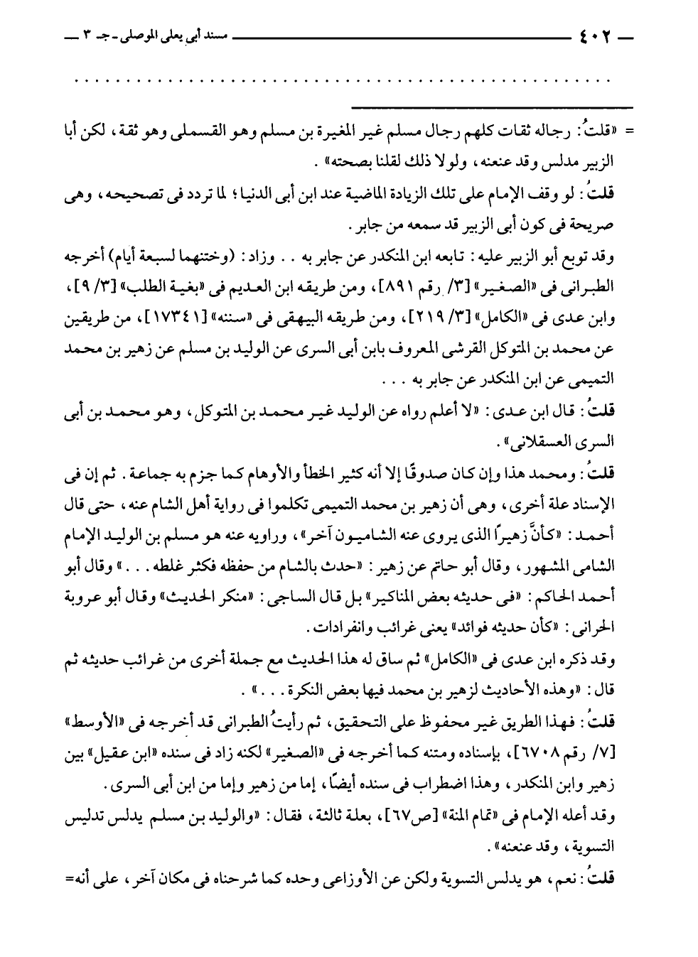 قلتُ: فهذا الطريق غير محفوظ على التحقيق، ثم رأيتُ الطبراني قد أخرجه في "الأوسط" [٧/ رقم ٦٧٠٨]، بإسناده ومتنه كما أخرجه في "الصغير" لكنه زاد في سنده "ابن عقيل" بين زهير وابن المنكدر، وهذا اضطراب في سنده أيضًا، إما من زهير وإما من ابن أبى السرى.