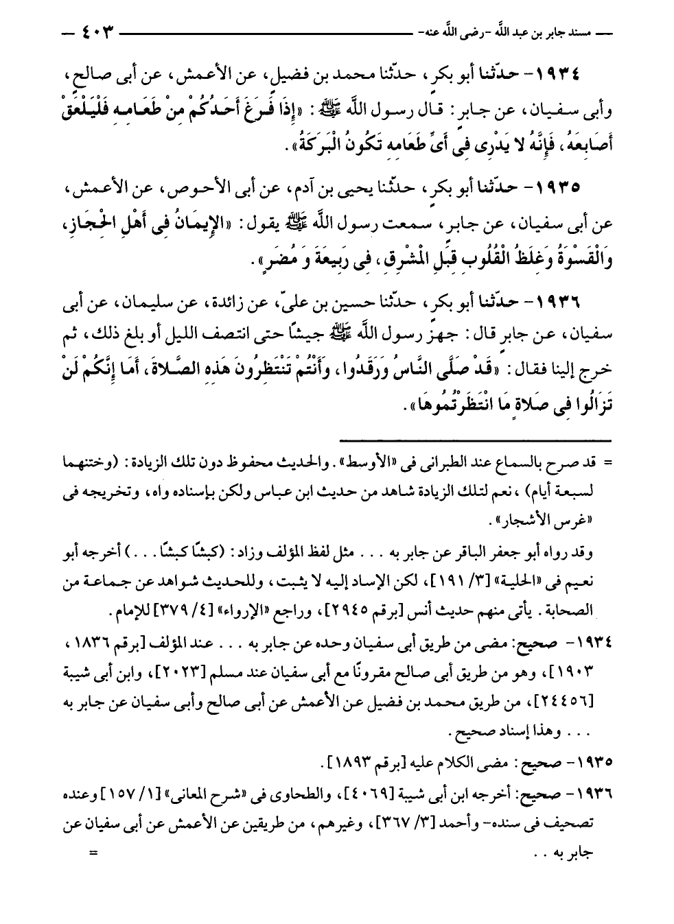 ١٩٣٤ - صحيح: مضى من طريق أبى سفيان وحده عن جابر به ... عند المؤلف [برقم ١٨٣٦، ١٩٠٣]، وهو من طريق أبى صالح مقرونًا مع أبى سفيان عند مسلم [٢٠٢٣]، وابن أبى شيبة [٢٤٤٥٦]، من طريق محمّد بن فضيل عن الأعمش عن أبى صالح وأبى سفيان عن جابر به ... وهذا إسناد صحيح.