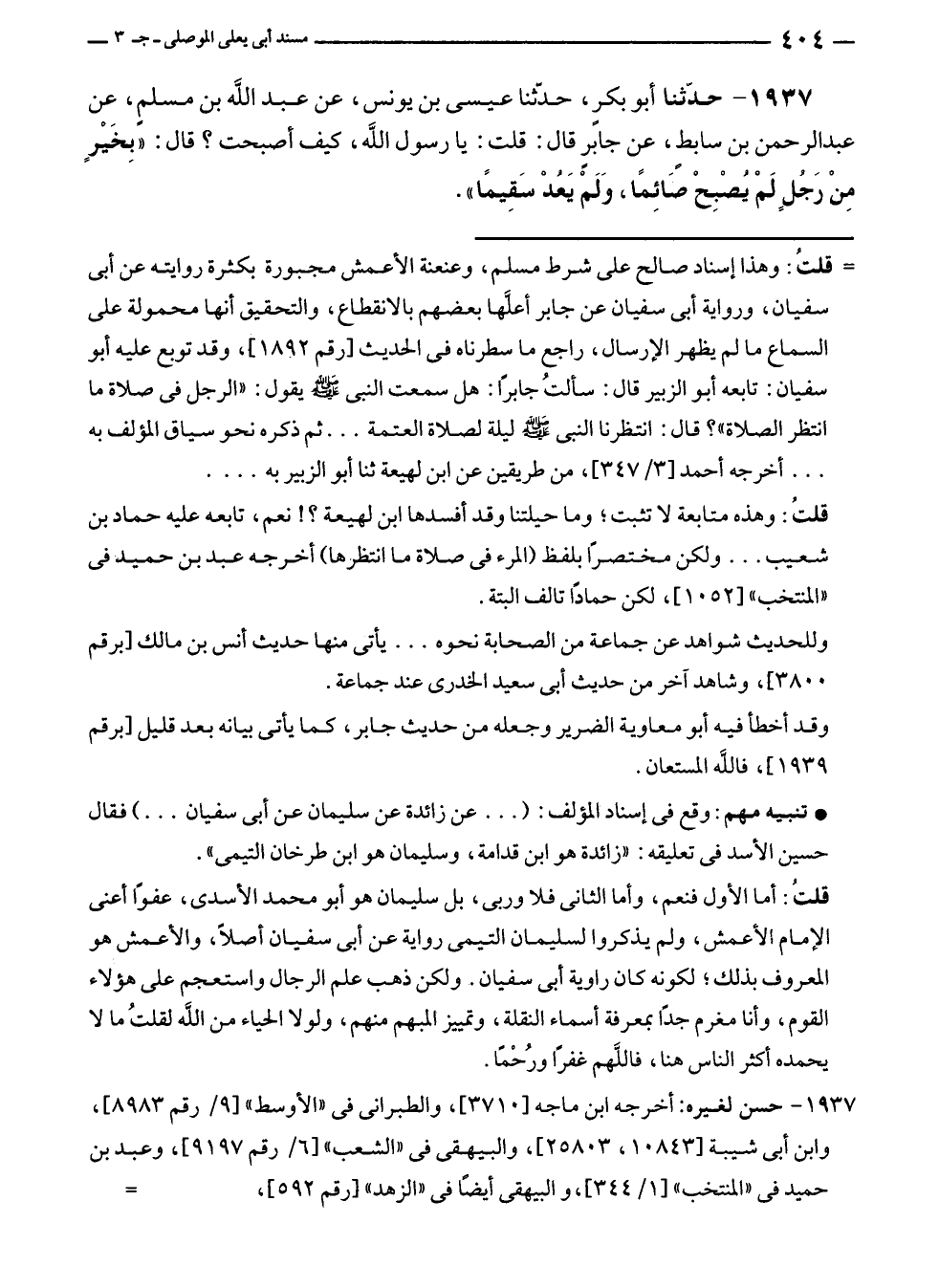 ١٩٣٧ - حَدَّثَنَا أبو بكرٍ، حَدَّثَنَا عيسى بن يونس، عن عبد الله بن مسلمٍ، عن عبد الرحمن بن سابط، عن جابرٍ قال: قلت: يا رسول الله، كيف أصبحت؛ قال: "بِخَيْرٍ مِنْ رَجُلٍ لَمْ يُصْبِحْ صَائِمًا، وَلَمْ يَعُدْ سَقِيمًا".