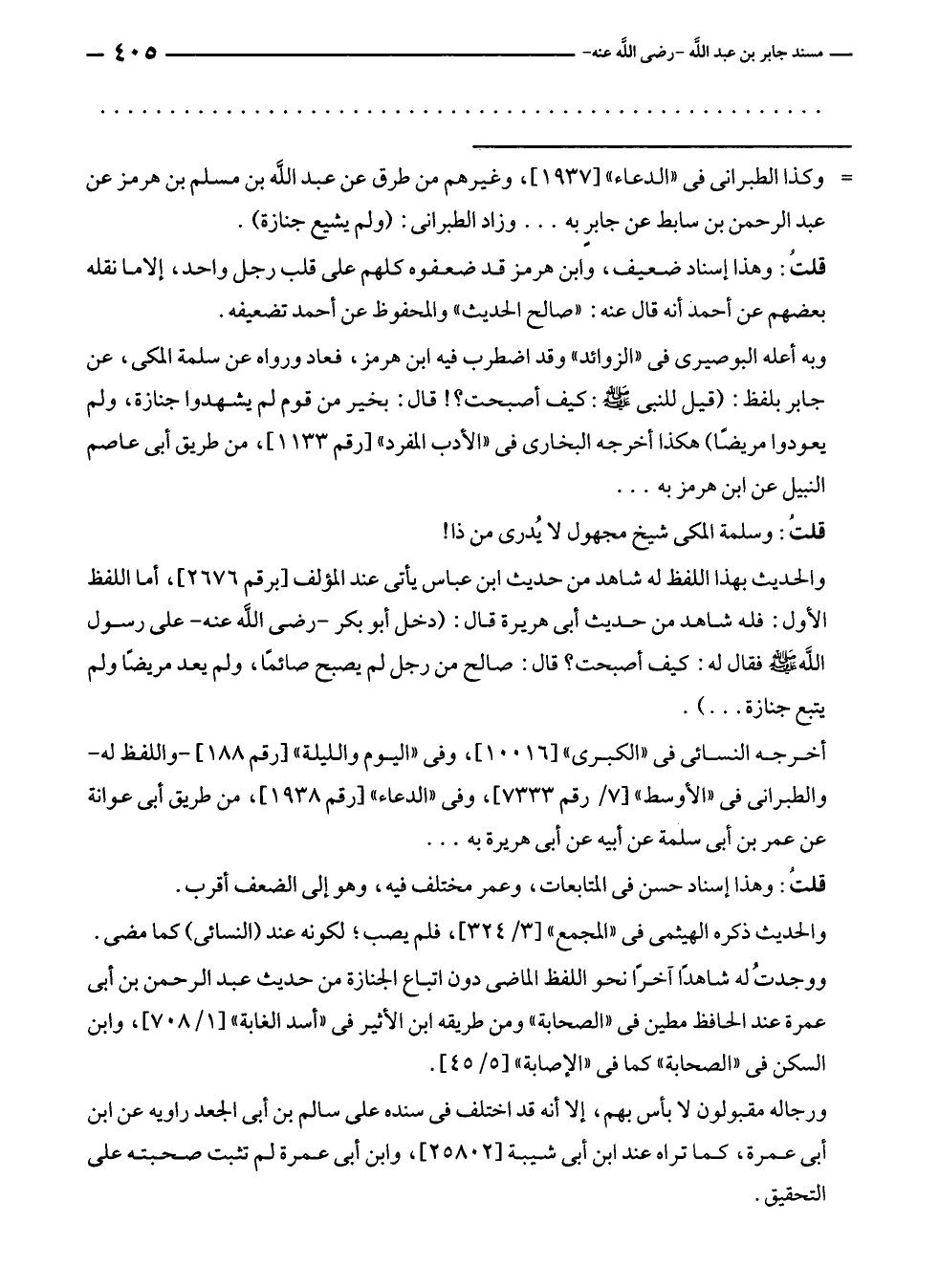 وبه أعله البوصيرى في "الزوائد" وقد اضطرب فيه ابن هرمز، فعاد ورواه عن سلمة المكى، عن جابر بلفظ: (قيل للنبى - صلى الله عليه وسلم -: كيف أصبحت؟! قال: بخير من قوم لم يشهدوا جنازة، ولم يعودوا مريضًا) هكذا أخرجه البخارى في "الأدب المفرد" [رقم ١١٣٣]، من طريق أبى عاصم النبيل عن ابن هرمز به ...