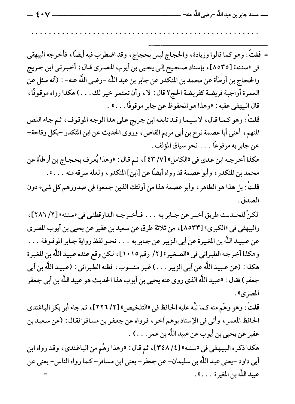 = قلتُ: وهو كما قالوا وزيادة، والحجاج ليس بحجاج، وقد اضطرب فيه أيضًا، فأخرجه البيهقيّ في "سننه" [٨٥٣٥]، بإسناد صحيح إلى يحيى بن أيوب المصرى قال: أخبرنى ابن جريج والحجاج بن أرطأة عن محمّد بن المنكدر عن جابر بن عبد الله - رضى الله عنه -: (أنه سئل عن العمرة أواجبة فريضة كفريضة الحج؟ قال: لا، وأن تعتمر خير لك ... ) هكذا رواه موقوفًا، قال البيهقيّ عقبه: "وهذا هو المحفوظ عن جابر موقوفًا ... ".