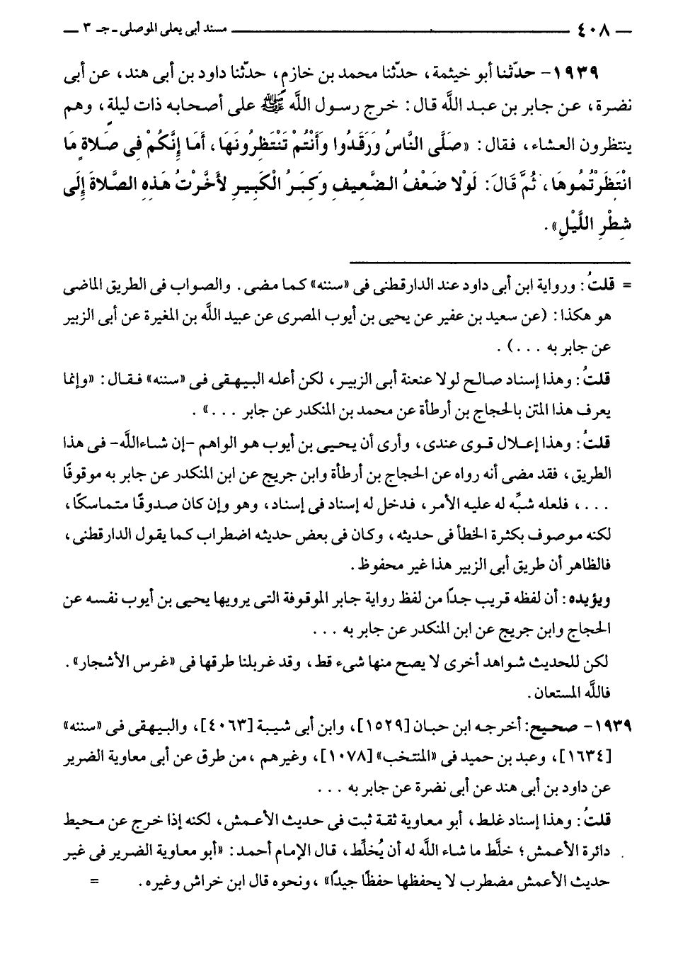 ١٩٣٩ - حَدَّثَنَا أبو خيثمة، حَدَّثَنَا محمّد بن خازم، حَدَّثَنَا داود بن أبى هند، عن أبى نضرة، عن جابر بن عبد الله قال: خرج رسول الله - صلى الله عليه وسلم - على أصحابه ذات ليلةٍ، وهم ينتظرون العشاء، فقال: "صَلَّى النَّاسُ وَرَقَدُوا وَأَنْتُمْ تَنْتَظِرُونَهَا، أَمَا إِنَّكُمْ فِي صَلاةٍ مَا انْتظرْتُمُوهَا، ثُمَّ قَالَ: لَوْلا ضَعْفُ الضَّعِيفِ وَكِبَرُ الْكَبِيرِ لأَخَّرْتُ هَذِهِ الصَّلاةَ إِلَى شِطْرِ اللَّيْلِ".