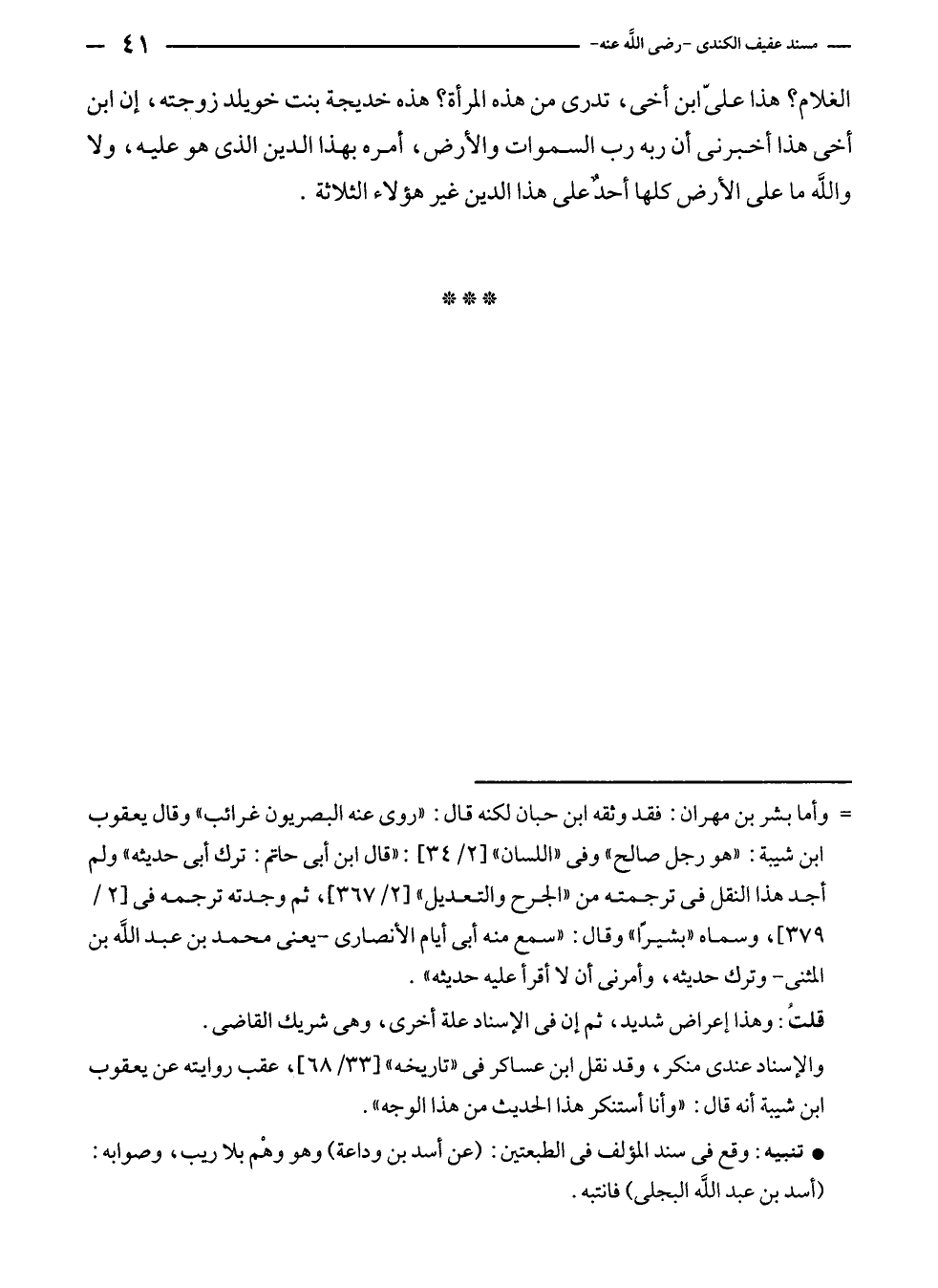 • تنبيه: وقع في سند المؤلف في الطبعتين: (عن أسد بن وداعة) وهو وهْم بلا ريب، وصوابه: (أسد بن عبد الله البجلى) فانتبه.