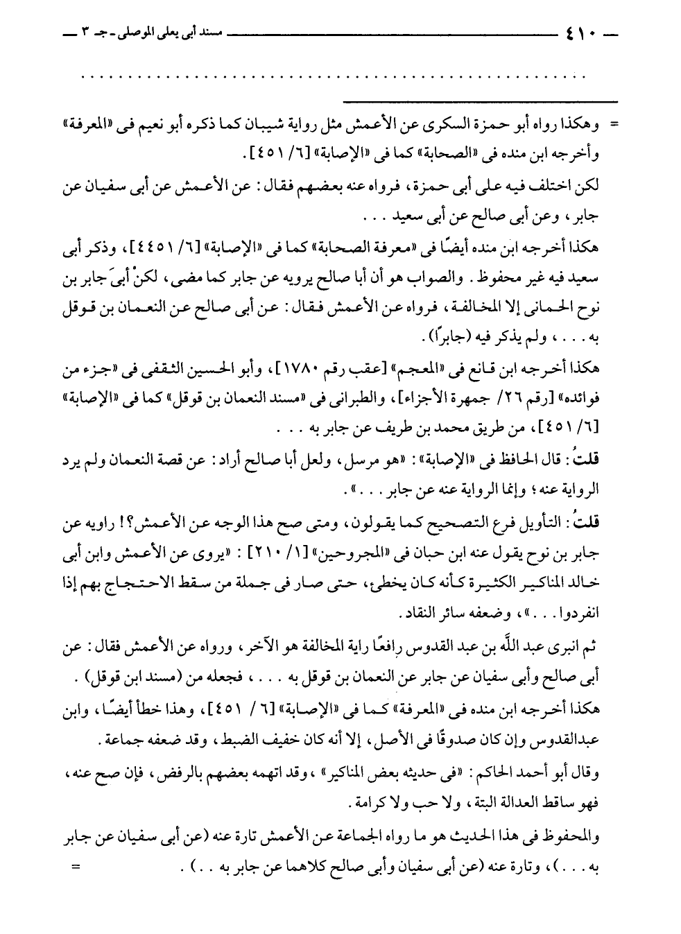 والمحفوظ في هذا الحديث هو ما رواه الجماعة عن الأعمش تارة عنه (عن أبى سفيان عن جابر به ... )، وتارة عنه (عن أبى سفيان وأبى صالح كلاهما عن جابر به .. ). =
