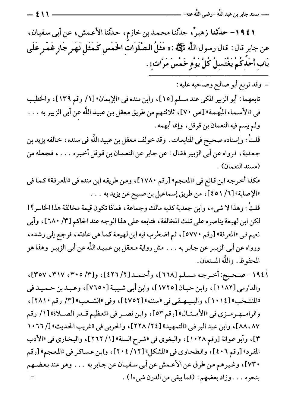 ١٩٤١ - حَدَّثَنَا زهيرٌ، حَدَّثَنَا محمد بن خازمٍ، حَدَّثَنَا الأعمش، عن أبى سفيان، عن جابرٍ قال: قال رسول الله - صلى الله عليه وسلم -: "مَثَلُ الصَّلَوَاتِ الخمْسِ كَمَثَلِ نَهَرٍ جَارٍ غَمْر عَلَى بَابِ أَحَدِكمْ يَغْتَسِل كل يَوْمٍ خَمْسَ مَرَّاتٍ".
