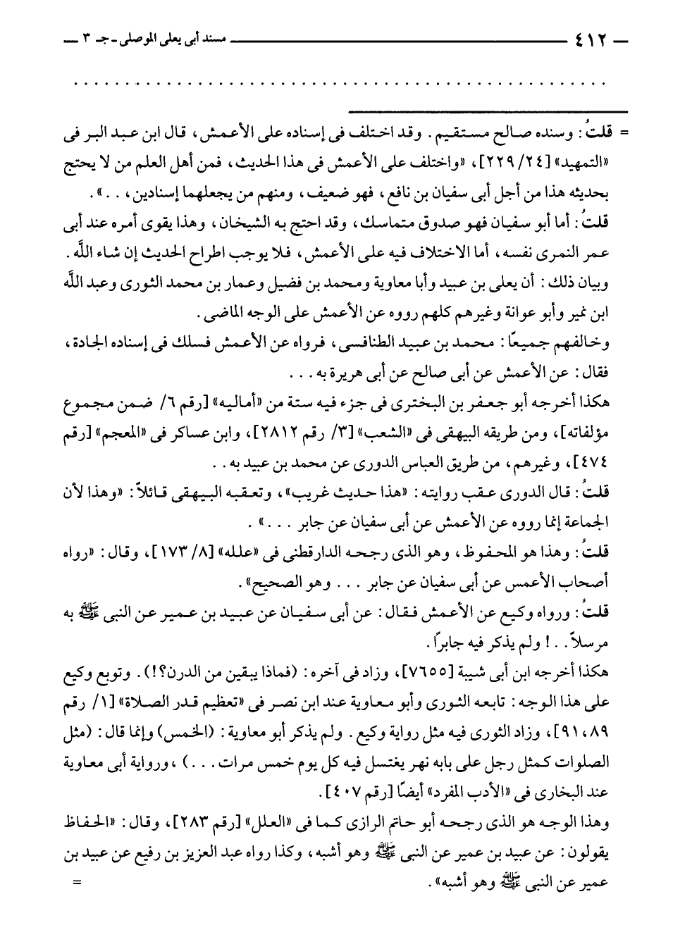 قلتُ: قال الدورى عقب روايته: "هذا حديث غريب"، وتعقبه البيهقى قائلًا: "وهذا لأن الجماعة إنما رووه عن الأعمش عن أبى سفيان عن جابر ... ".