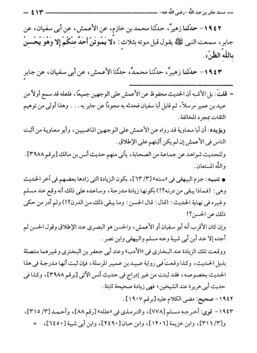 = قلتُ: بل الأشبه أن الحديث محفوظ عن الأعمش على الوجهين جميعًا، فلعله قد سمع أولًا من عبيد بن عمير مرسلًا، ثم قابل أبا سفيان فحدثه به مجودًا عن جابر به ... وهذا أولى من توهيم الثقات بمجرد المخالفة.