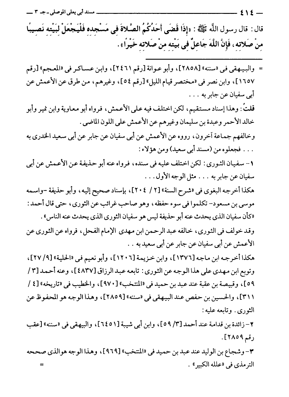 وخالفهم جماعة آخرون، رووه عن الأعمش عن أبى سفيان عن جابر عن أبى سعيد الخدرى به ... فجعلوه من (مسند أبى سعيد) ومن هؤلاء: