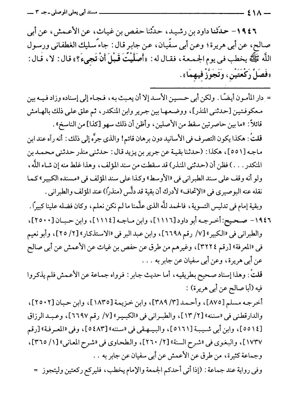 ١٩٤٦ - حَدَّثَنَا داود بن رشيد، حَدَّثَنَا حفص بن غياثٍ، عن الأعمش، عن أبى صالح، عن أبى هريرة؛ وعن أبى سفيان، عن جابرٍ قال: جاء سليك الغطفانى ورسول الله - صلى الله عليه وسلم - يخطب في يوم الجمعة، فقال له: "أَصَلَّيْتَ قَبْلَ أَنْ تَجِئَ؟ " قال: لا، قال: "فَصَلِّ رَكعَتَيْنِ، وَتَجَوَّزْ فِيهِمَا".