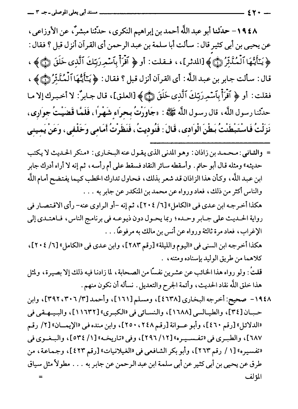 ١٩٤٨ - حَدَّثَنَا أبو عبد الله أحمد بن إبراهيم النكرى، حَدَّثَنَا مبشرٌ، عن الأوزاعى، عن يحيى بن أبى كثيرٍ قال: سالت أبا سلمة بن عبد الرحمن أي القرآن أنزل قبل؟ فقال: {يَاأَيُّهَا الْمُدَّثِّرُ (١)} [المدثر: ١]، فقلت: أو {اقْرَأْ بِاسْمِ رَبِّكَ الَّذِي خَلَقَ (١)}، قال: سألت جابر بن عبد الله: أي القرآن أنزل قبل؟ فقال: {يَاأَيُّهَا الْمُدَّثِّرُ (١)}، فقلت: أو {اقْرَأْ بِاسْمِ رَبِّكَ الَّذِي خَلَقَ (١)} [العلق: ١]، قال جابرٌ: لا أخبرك إلا ما حَدَّثَنَا رسول الله، قال رسول الله - صلى الله عليه وسلم -: "جَاوَرْتُ بِحِرَاءٍ شَهْرًا، فَلَمَّا قَضَيْتُ جِوَارِى، نَزَلْتُ فَاسْتَبْطَنْتُ بَطْنَ الْوَادِى، قَالَ: فَنُودِيتُ، فَنَظَرْتُ أَمَامِى وَخَلْفِى، وَعَنْ يَمِينِى