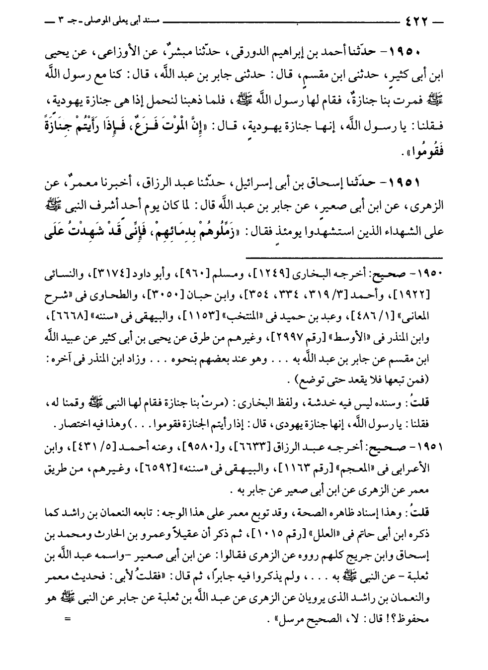 ١٩٥٠ - حَدَّثَنَا أحمد بن إبراهيم الدورقى، حَدَّثَنَا مبشرٌ، عن الأوزاعى، عن يحيى بن أبى كثيرٍ، حدثنى ابن مقسمٍ، قال: حدثنى جابر بن عبد الله، قال: كنا مع رسول الله - صلى الله عليه وسلم - فمرت بنا جنازةٌ، فقام لها رسول الله - صلى الله عليه وسلم -، فلما ذهبنا لنحمل إذا هي جنازة يهودية، فقلنا: يا رسول الله، إنها جنازة يهوديةٍ، قال: "إِنَّ الموْتَ فَزَعٌ، فَإِذَا رَأَيْتُمْ جِنَازَةً فَقُومُوا".
