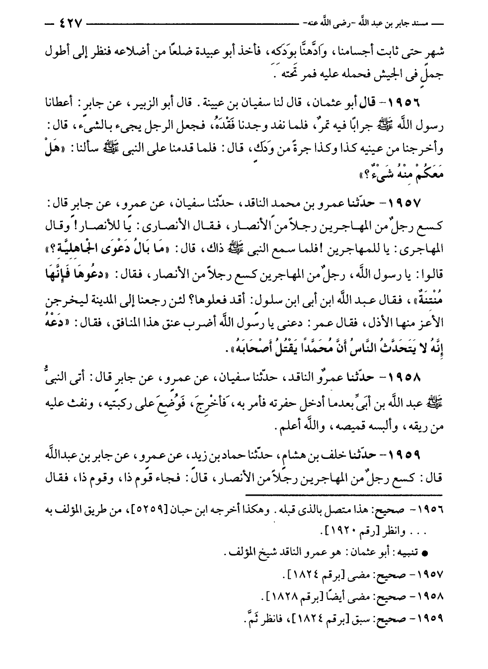 ١٩٥٧ - حَدَّثَنَا عمرو بن محمدٍ الناقد، حَدَّثَنَا سفيان، عن عمرٍو، عن جابر قال: كسع رجلٌ من المهاجرين رجلًا من الأنصار، فقال الأنصارى: يا للأنصار! وقال المهاجرى: يا للمهاجرين! فلما سمع النبي - صلى الله عليه وسلم - ذاك، قال: "مَا بَالُ دَعْوَى الجاهِلِيَّةِ؟ " قالوا: يا رسول الله، رجلٌ من المهاجرين كسع رجلًا من الأنصار، فقال: "دعُوهَا فَإِنَّهَا مُنْتِنَةٌ"، فقال عبد الله بن أبى بن سلولٍ: أقد فعلوها؟ لئن رجعنا إلى المدينة ليخرجن الأعز منها الأذل، فقال عمر: دعنى يا رسول الله أضرب عنق هذا المنافق، فقال: "دَعْه إِنَّهُ لا يَتَحَدَّثُ النَّاسُ أَنَّ محَمَّدًا يَقْتُل أَصْحَابَهُ".