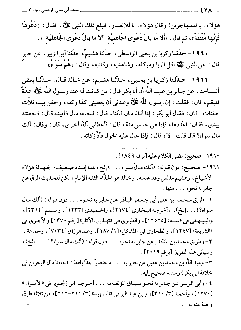 هؤلاء: يا للمهاجرين! وقال هؤلاء: يا للأنصار، فبلغ ذلك النبي - صلى الله عليه وسلم -، فقال: "دَعُوهَما فَإِنَّهَا مُنْتِنَةٌ"، ثم قال: "أَلا مَا بَالُ دَعْوَى الجاهِلِيَّةِ! أَلا مَا بَالُ دَعْوَى الجَاهِلِيَّةِ! ". ١٩٦٠ - حَدَّثَنَا زكريا بن يحيى الواسطى، حَدَّثَنَا هشيمٌ، حَدَّثَنَا أبو الزبير، عن جابر قال: لعن النبي - صلى الله عليه وسلم - آكل الربا وموكله، وشاهديه، وكاتبه، وقال: "هُمْ سَوَاءٌ".