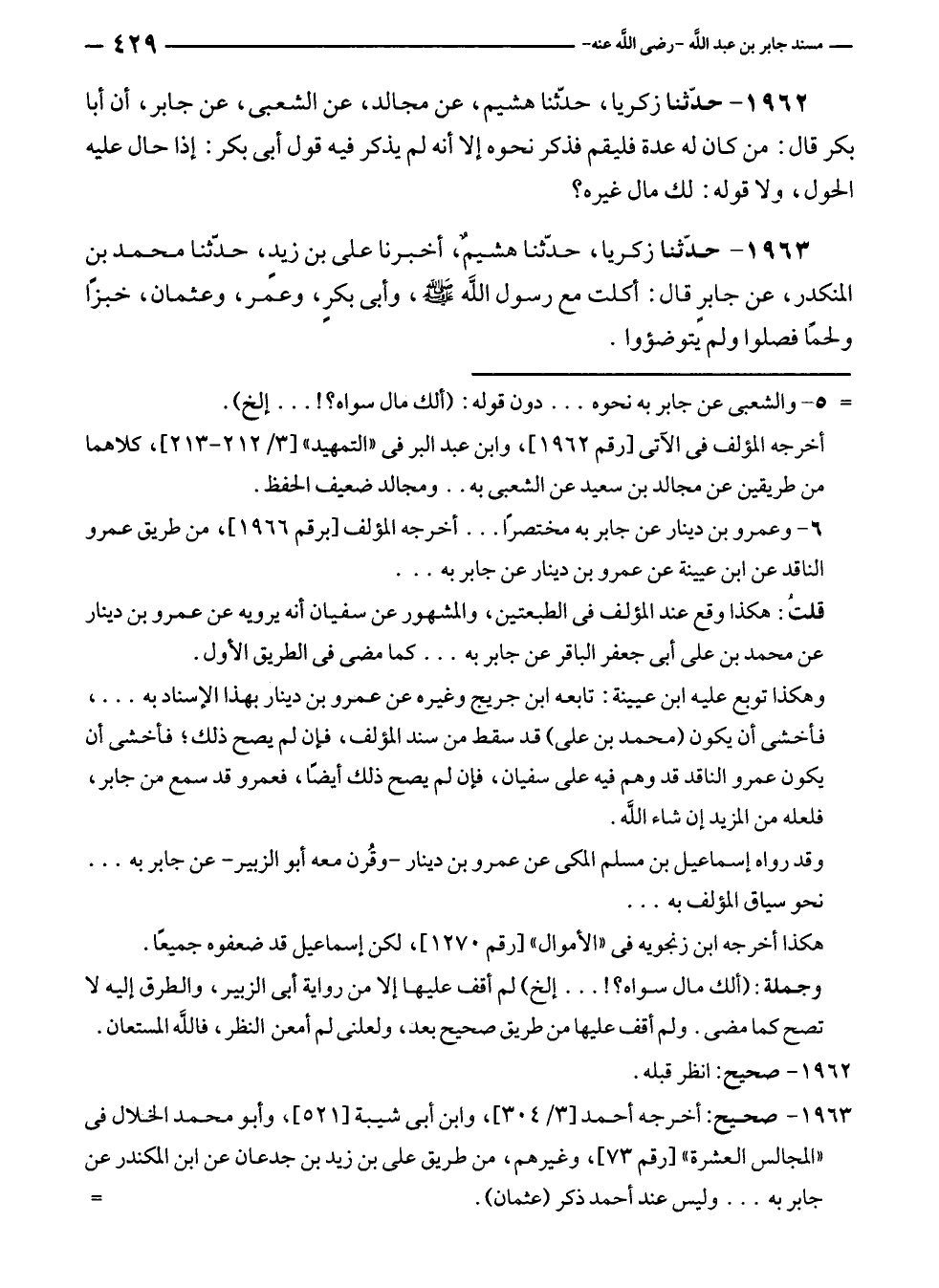 وهكذا توبع عليه ابن عيينة: تابعه ابن جريج وغيره عن عمرو بن دينار بهذا الإسناد به ... ، فأخشى أن يكون (محمد بن على) قد سقط من سند المؤلف، فإن لم يصح ذلك؛ فأخشى أن يكون عمرو الناقد قد وهم فيه على سفيان، فإن لم يصح ذلك أيضًا، فعمرو قد سمع من جابر، فلعله من المزيد إن شاء الله.