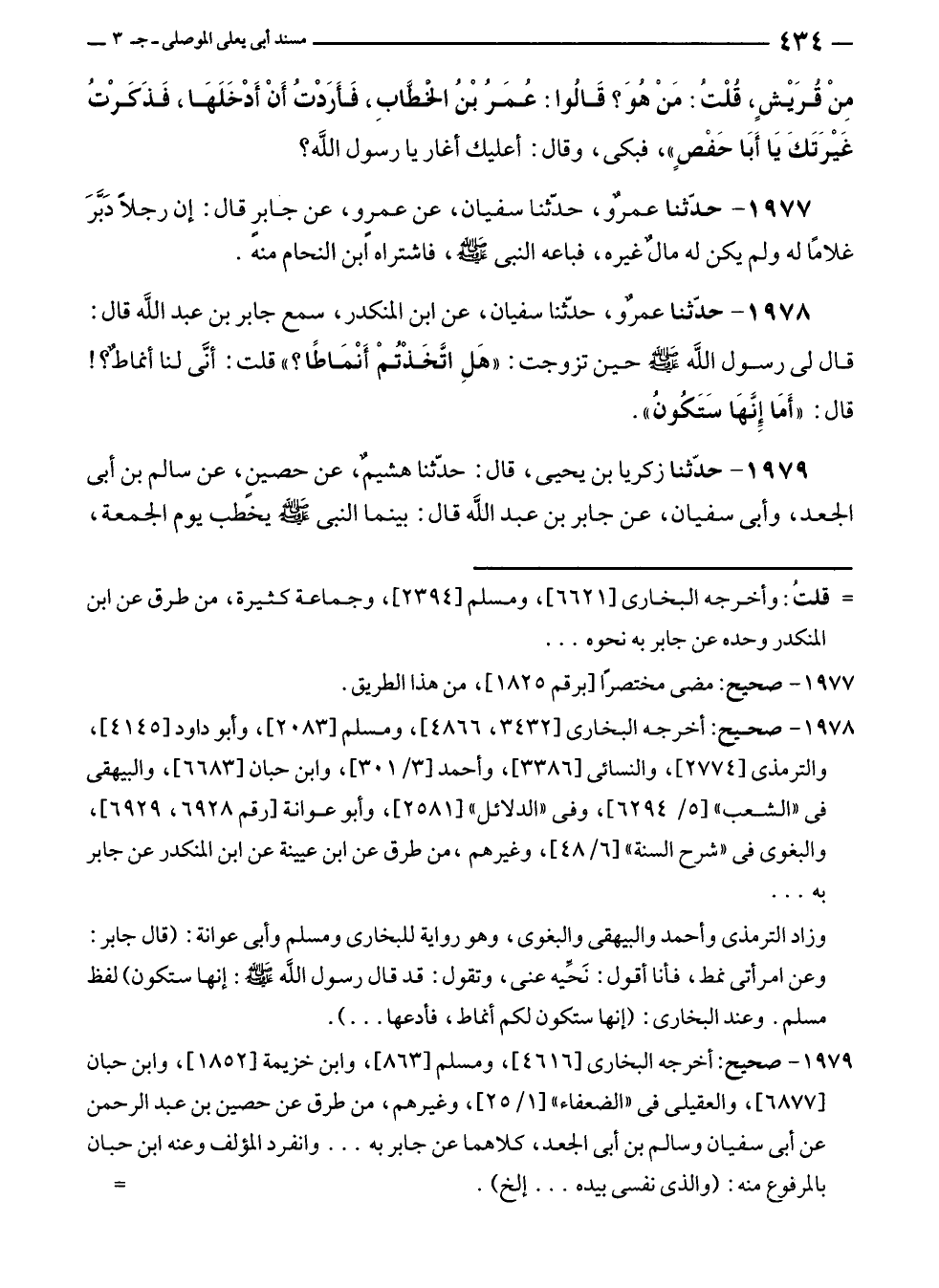 ١٩٧٩ - صحيح: أخرجه البخارى [٤٦١٦]، ومسلم [٨٦٣]، وابن خزيمة [١٨٥٢]، وابن حبان [٦٨٧٧]، والعقيلى في "الضعفاء" [١/ ٢٥]، وغيرهم، من طرق عن حصين بن عبد الرحمن عن أبى سفيان وسالم بن أبى الجعد، كلاهما عن جابر به ... وانفرد المؤلف وعنه ابن حبان بالمرفوع منه: (والذى نفسى بيده ... إلخ). =