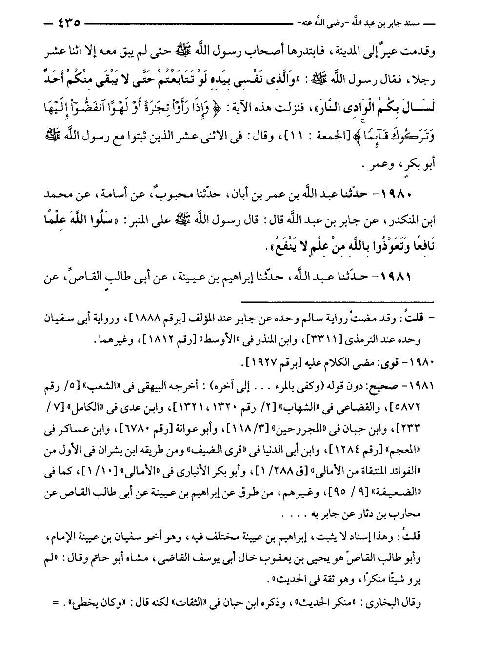 ١٩٨٠ - حَدَّثَنَا عبد الله بن عمر بن أبان، حَدَّثَنَا محبوبٌ، عن أسامة، عن محمد بن المنكدر، عن جابر بن عبد الله قال: قال رسول الله - صلى الله عليه وسلم - على المنبر: "سَلُوا اللَّهَ عِلْمًا نَافِعًا وَتَعَوَّذُوا بِاللَّهِ مِنْ عِلْمٍ لا يَنْفَعُ".