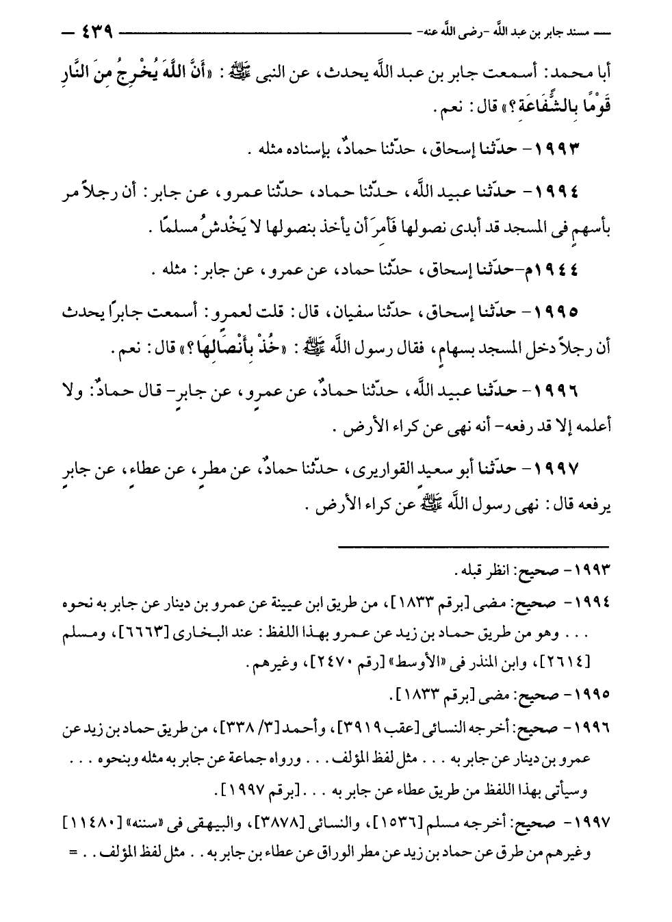 ١٩٩٤ - صحيح: مضى [برقم ١٨٣٣]، من طريق ابن عيينة عن عمرو بن دينار عن جابر به نحوه ... وهو من طريق حماد بن زيد عن عمرو بهذا اللفظ: عند البخارى [٦٦٦٣]، ومسلم [٢٦١٤]، وابن المنذر في "الأوسط" [رقم ٢٤٧٠]، وغيرهم.