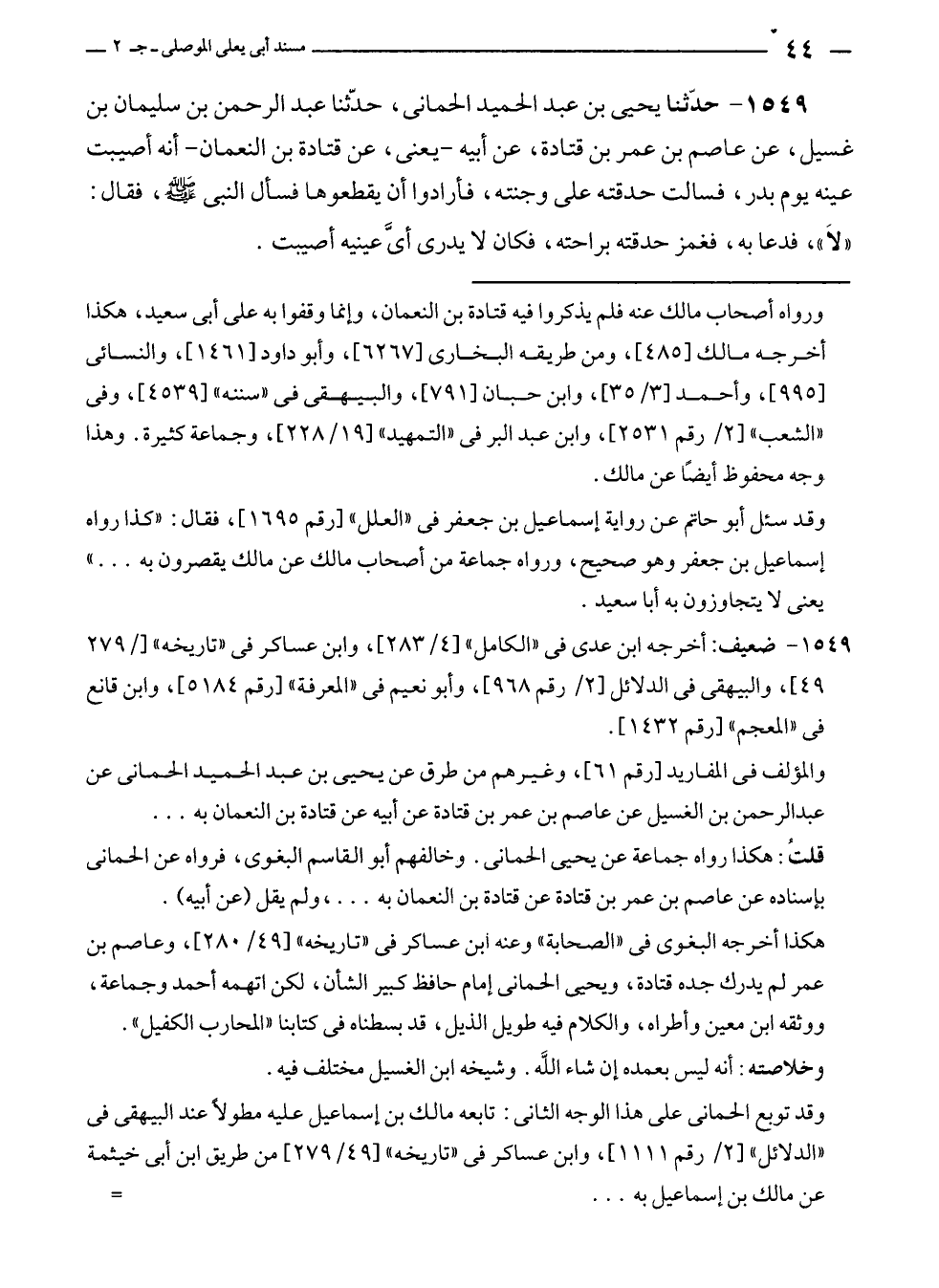 ١٥٤٩ - حدّثنا يحيى بن عبد الحميد الحمانى، حدّثنا عبد الرحمن بن سليمان بن غسيل، عن عاصم بن عمر بن قتادة، عن أبيه - يعنى، عن قتادة بن النعمان - أنه أصيبت عينه يوم بدر، فسالت حدقته على وجنته، فأرادوا أن يقطعوها فسأل النبي - صلى الله عليه وسلم -، فقال: "لَا"، فدعا به، فغمز حدقته براحته، فكان لا يدرى أيَّ عينيه أصيبت.