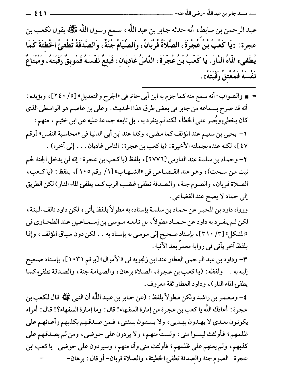 ٣ - وداود بن عبد الرحمن العطار عند ابن زنجويه في "الأموال" [برقم ١٠٣١]، بإسناد صحيح إليه به .. ولفظه: (يا كعب بن عجرة، الصلاة برهان، والصيامة جنة، والصدقة تطفئ كما يطفئ الماء النار)، وداود العطار ثقة معروف.