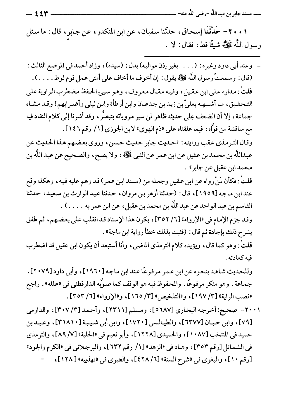 ٢٠٠١ - حَدَّثَنَا إسحاق، حدّثنا سفيان، عن ابن المنكدر، عن جابر، قال: ما سئل رسول الله - صلى الله عليه وسلم - شيئًا قط، فقال: لا.