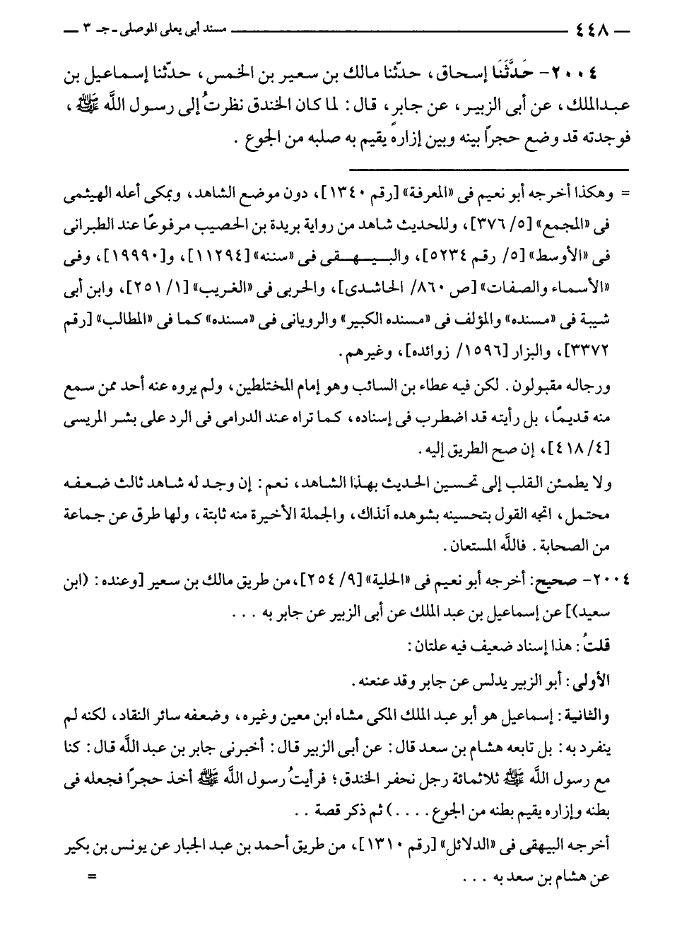 والثانية: إسماعيل هو أبو عبد الملك المكى مشاه ابن معين وغيره، وضعفه سائر النقاد، لكنه لم ينفرد به: بل تابعه هشام بن سعد قال: عن أبى الزبير قال: أخبرنى جابر بن عبد الله قال: كنا مع رسول الله - صلى الله عليه وسلم - ثلاثمائة رجل نحفر الخندق؛ فرأيتُ رسول الله - صلى الله عليه وسلم - أخذ حجرًا فجعله في بطنه وإزاره يقيم بطنه من الجوع .... ) ثم ذكر قصة ..