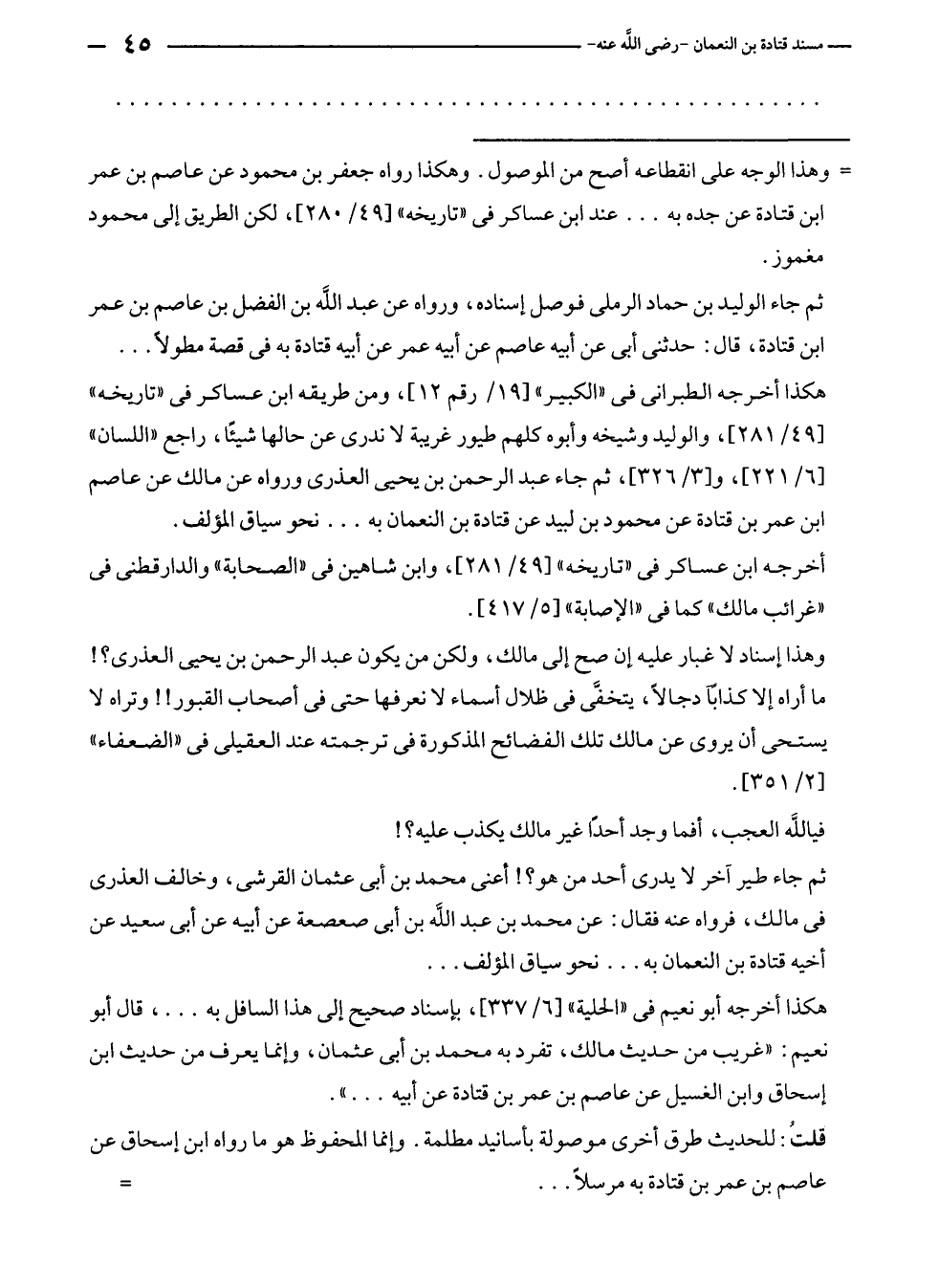 = وهذا الوجه على انقطاعه أصح من الموصول. وهكذا رواه جعفر بن محمود عن عاصم بن عمر بن قتادة عن جده به ... عند ابن عساكر في "تاريخه" [٤٩/ ٢٨٠]، لكن الطريق إلى محمود مغموز.