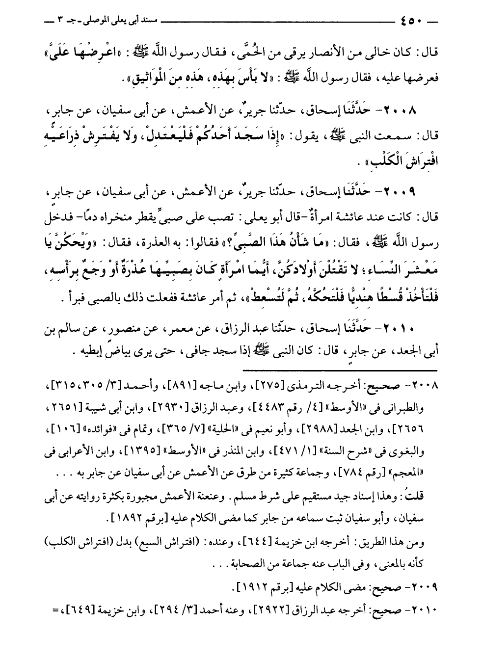 ٢٠٠٨ - صحيح: أخرجه الترمذى [٢٧٥]، وابن ماجه [٨٩١]، وأحمد [٣/ ٣٠٥، ٣١٥]، والطبرانى في "الأوسط" [٤١/ رقم ٤٤٨٣]، وعبد الرزاق [٢٩٣٠]، وابن أبى شيبة [٢٦٥١، ٢٦٥٦]، وابن الجعد [٢٩٨٨]، وأبو نعيم في "الحلية" [٧/ ٣٦٥]، وتمام في "فوائده" [١٠٦]، والبغوى في "شرح السنة" [١/ ٤٧١]، وابن المنذر في "الأوسط" [١٣٩٥]، وابن الأعرابى في "المعجم" [رقم ٧٨٤]، وجماعة كثيرة من طرق عن الأعمش عن أبى سفيان عن جابر به ...
