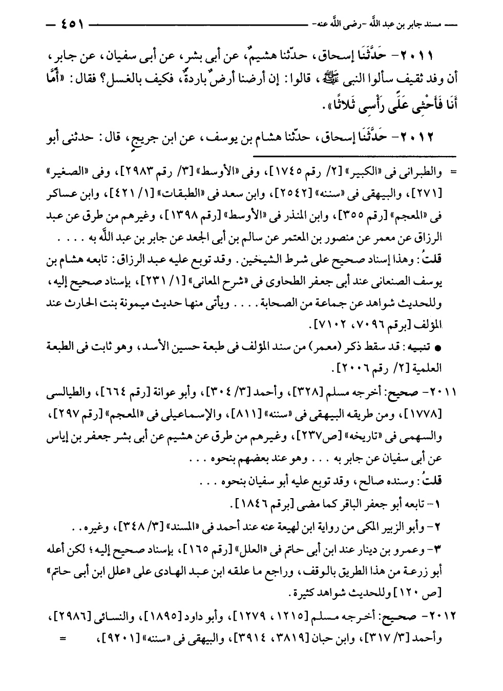 ٢٠١١ - صحيح: أخرجه مسلم [٣٢٨]، وأحمد [٣/ ٣٠٤]، وأبو عوانة [رقم ٦٦٤]، والطيالسى [١٧٧٨]، ومن طريقه البيهقى في "سننه" [٨١١]، والإسماعيلى في "المعجم" [رقم ٢٩٧]، والسهمى في "تاريخه" [ص ٢٣٧]، وغيرهم من طرق عن هشيم عن أبى بشر جعفر بن إياس عن أبى سفيان عن جابر به ... وهو عند بعضهم بنحوه ...