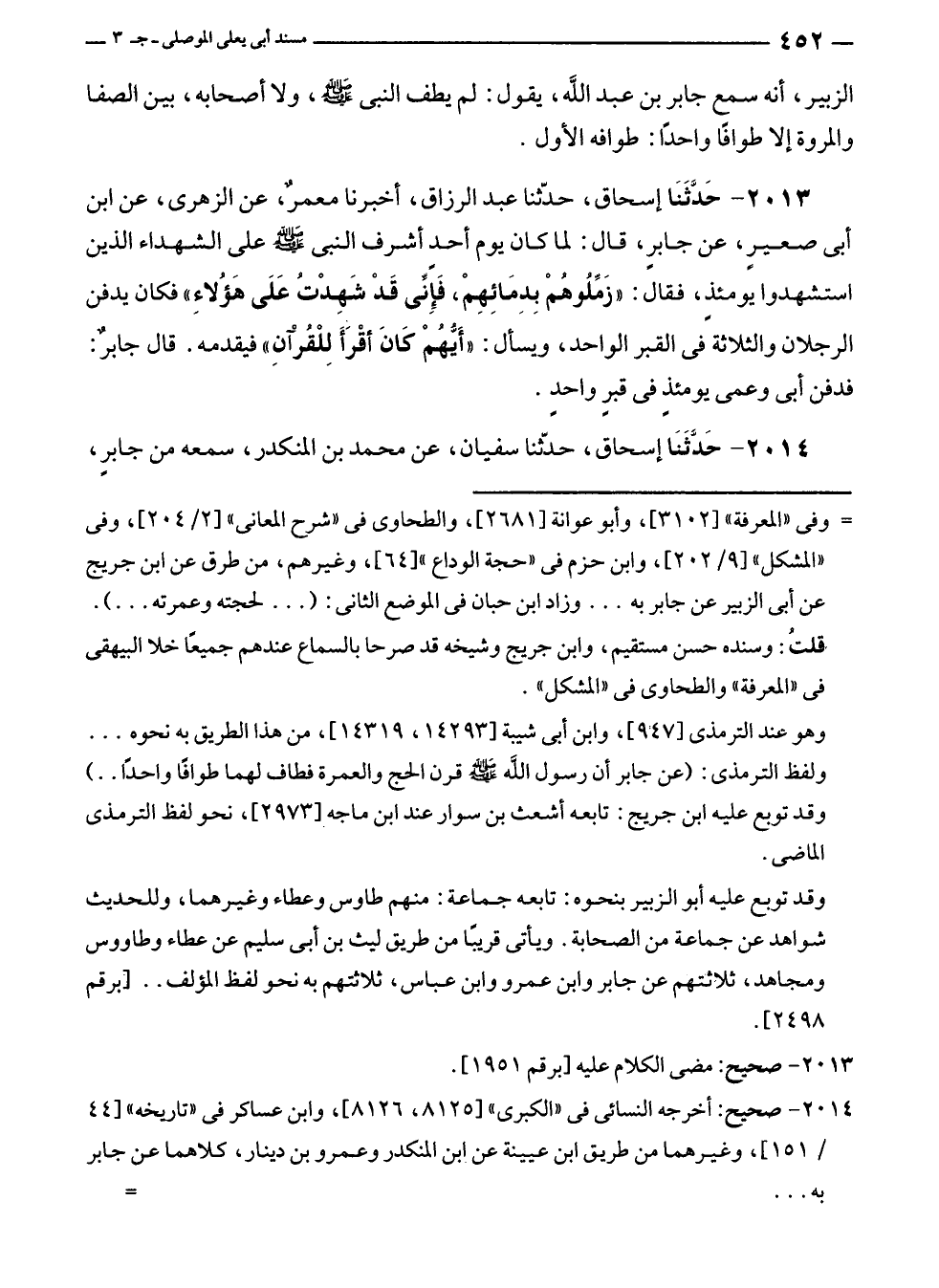 ٢٠١٣ - حَدَّثَنَا إسحاق، حدّثنا عبد الرزاق، أخبرنا معمرٌ، عن الزهرى، عن ابن أبى صعيرٍ، عن جابرٍ، قال: لما كان يوم أحد أشرف النبي - صلى الله عليه وسلم - على الشهداء الذين استشهدوا يومئذٍ، فقال: "زَمِّلُوهُمْ بِدِمَائِهِمْ، فَإنِّى قَدْ شَهِدْتُ عَلَى هَؤُلاءِ" فكان يدفن الرجلان والثلاثة في القبر الواحد، ويسأل: "أَيُّهُمْ كانَ أقْرَأَ لِلْقُرْآنِ" فيقدمه. قال جابرٌ: فدفن أبى وعمى يومئذٍ في قبرٍ واحدٍ.