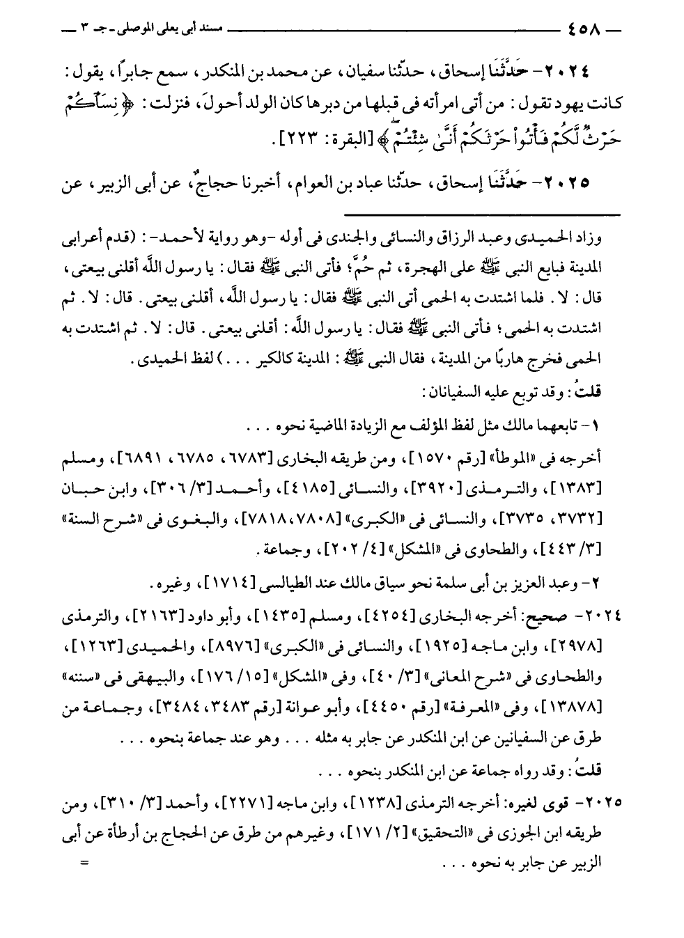 ٢٠٢٤ - حَدَّثَنَا إسحاق، حدّثنا سفيان، عن محمد بن المنكدر، سمع جابرًا، يقول: كانت يهود تقول: من أتى امرأته في قبلها من دبرها كان الولد أحولَ، فنزلت: {نِسَاؤُكُمْ حَرْثٌ لَكُمْ فَأْتُوا حَرْثَكُمْ أَنَّى شِئْتُمْ} [البقرة: ٢٢٣].