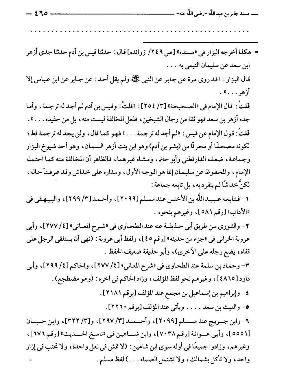 قلتُ: قول الإمام عن قيس: "لم أجد له ترجمة ... ، فهو كما قال، ولن يجد له ترجمة قط؛ لكونه مصحفًا أو محرفًا من (بشر بن آدم) وهو ابن بنت أزهر السمان، وهو أحد شيوخ البزار وجماعة، ضعفه الدارقطنى وأبو حاتم، ومشاه غيرهما، فالظاهر أن المخالفة منه كما احتمله الإمام، والمحفوظ عن سليمان إنما هو الوجه الأول، ومداره على خداش وقد عرفتَ حاله، لكنَّ خداشًا لم ينفرد به، بل تابعه جماعة: