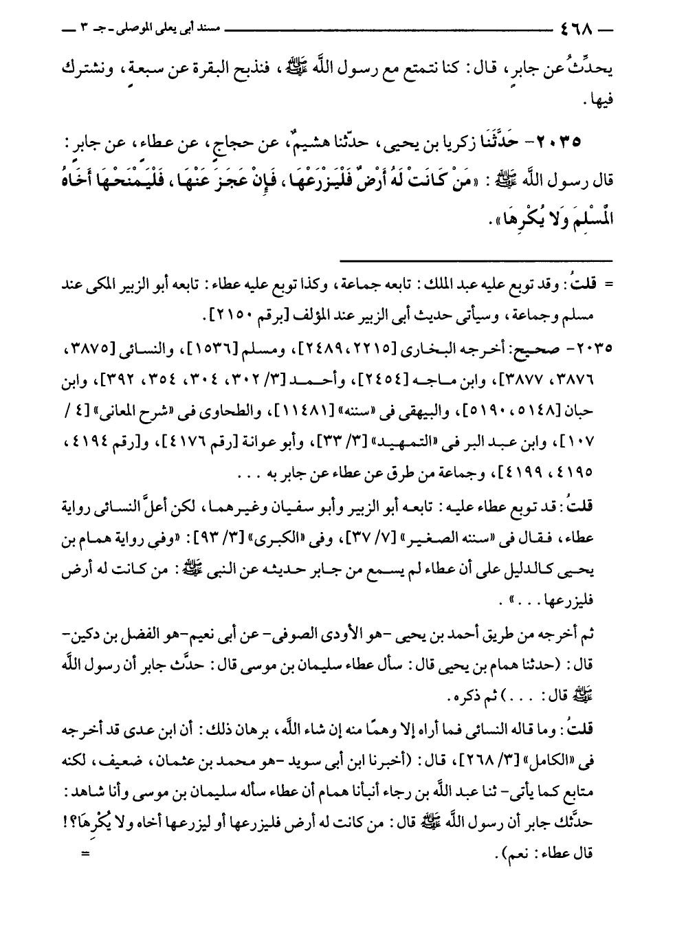 قلتُ: قد توبع عطاء عليه: تابعه أبو الزبير وأبو سفيان وغيرهما، لكن أعلَّ النسائي رواية عطاء، فقال في "سننه الصغير" [٧/ ٣٧]، وفى "الكبرى" [٣/ ٩٣]: "وفي رواية همام بن يحيى كالدليل على أن عطاء لم يسمع من جابر حديثه عن النبي - صلى الله عليه وسلم -: من كانت له أرض فليزرعها ... ".