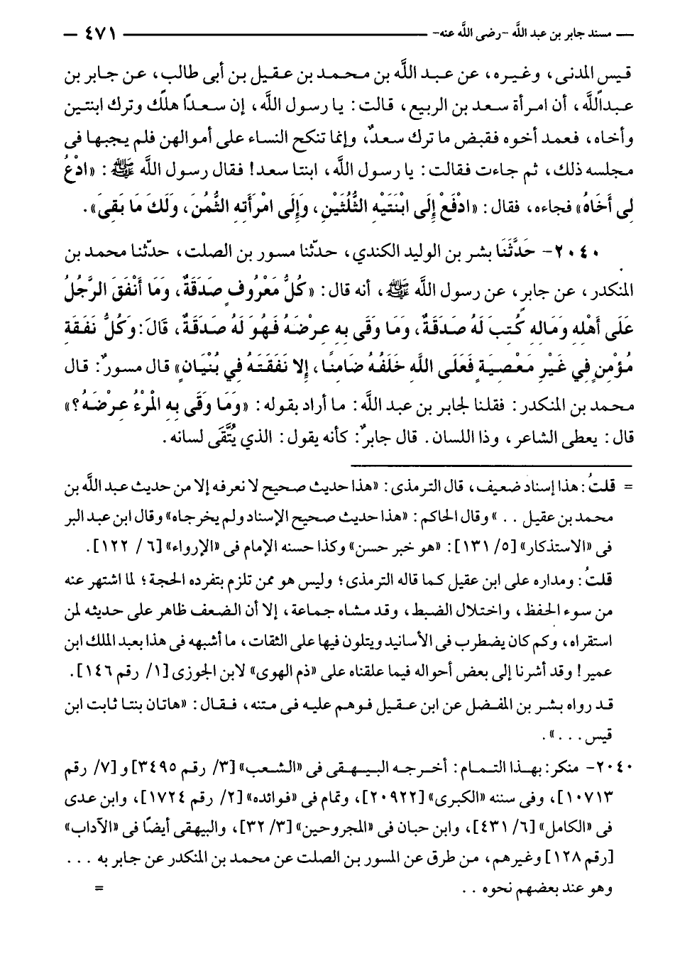 ٢٠٤٠ - حَدَّثَنَا بشر بن الوليد الكندي، حدّثنا مسور بن الصلت، حدّثنا محمد بن المنكدر، عن جابرٍ، عن رسول الله - صلى الله عليه وسلم -، أنه قال: "كُلُّ مَعْرُوفٍ صَدَقَةٌ، وَمَما أَنْفَقَ الرَّجُل عَلَى أَهْلِهِ وَمَالِهِ كُتِبَ لَهُ صَدَقَةٌ، وَمَا وَقَى بِهِ عِرْضهُ فَهوَ لَهُ صَدَقَةٌ، قَالَ: وَكُلُّ نَفَقَةِ مُؤْمِنٍ فِي غَيْرِ مَعْصِيَةٍ فَعَلَى اللَّهِ خَلَفُهُ ضَامِنًا، إلا نَفَقَتَهُ فِي بنْيَانٍ" قال مسورٌ: قال محمد بن المنكدر: فقلنا لجابر بن عبد الله: ما أراد بقوله: "وَمَا وَقَى بِهِ المرْءُ عِرْضَهُ؟ " قال: يعطى الشاعر، وذا اللسان. قال جابرٌ: كأنه يقول: الذي يُتَّقَى لسانه.