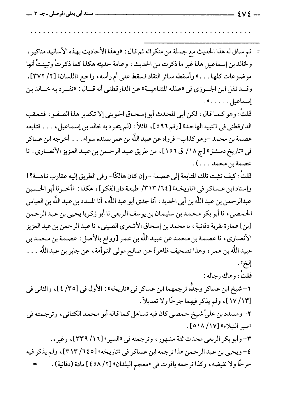 قلتُ: كيف تثبت تلك المتابعة إلى عصمة - وإن كان هالكًا - وفى الطريق إليه عقارب ناهسة؟! وإسناد ابن عساكر في "تاريخه" [٦٤/ ٣١٣/ طبعة دار الفكر]، هكذا: "أخبرنا أبو الحسين عبد الرحمن بن عبد الله بن أبى الحديد، أنا جدى أبو عبد الله، أنا المسدد بن عبد الله بن العباس الحمصى، نا أبو بكر محمد بن سليمان بن يوسف الربعى نا أبو زكريا يحيى بن عبد الرحمن [بن] عمارة بقرية دقانية، نا محمد بن إسحاق الأشعرى الصينى، نا عبد الرحمن بن عبد العزيز الأنصارى، نا عصمة بن محمد عن عبيد الله بن عمر [ووقع بالأصل: عصمة بن محمد بن عبيد الله بن عمر، وهذا تصحيف ظاهر] عن صالح مولى التوأمة، عن جابر بن عبد الله ... إلخ".