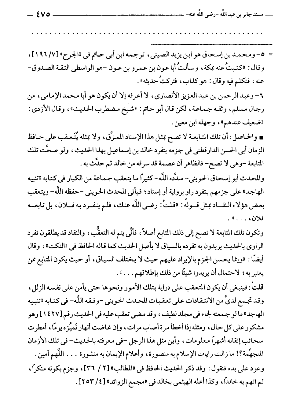 قلتُ: فينبغى أن يكون المتعقب على دراية بتلك الأمور ونحوها حتى يامن على نفسه الزلل، وقد تجمع لديَّ من الانتقادات على تعقبات المحدث الحوينى - وفقه الله - في كتابه "تنبيه الهاجد" ما لو جمعته لجاء في مجلد لطيف، وقد مضى تعقب عليه في الحديث رقم [١٤٧٢] وهو مشكور على كل حال، ومثله إذا أخطأ مرة أصاب مرات، وإن غاضت أنهار تَميِّزه يومًا، أمطرت سحائب إتقانه أشهرًا معلومات، وأين مثل هذا الرجل - في معرفته بالحديث - في تلك الأزمان المتجهِّمة؟! ما زالت رايات الإسلام به منصورة، وأعلام الإيمان به منشورة ... اللهم آمين.
