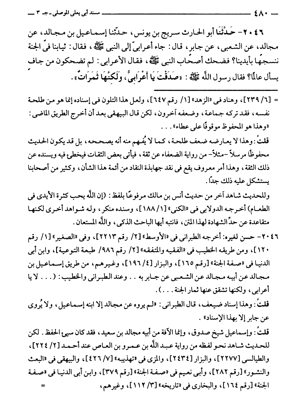 ٢٠٤٦ - حَدَّثَنَا أبو الحارث سريج بن يونس، حدّثنا إسماعيل بن مجالد، عن مجالد، عن الشعبى، عن جابر، قال: جاء أعرابيّ إلى النبي - صلى الله عليه وسلم -، فقال: ثيابنا في الجنة ننسجها بأيدينا؟ فضحك أصحاب النبي - صلى الله عليه وسلم -، فقال الأعرابى: لم تضحكون من جافٍ يسأل عالمًا؟ فقال رسول الله - صلى الله عليه وسلم -: "صدَقْتَ يَا أَعْرَابِيُّ، وَلَكِنَّهَا ثَمَرَاتٌ".