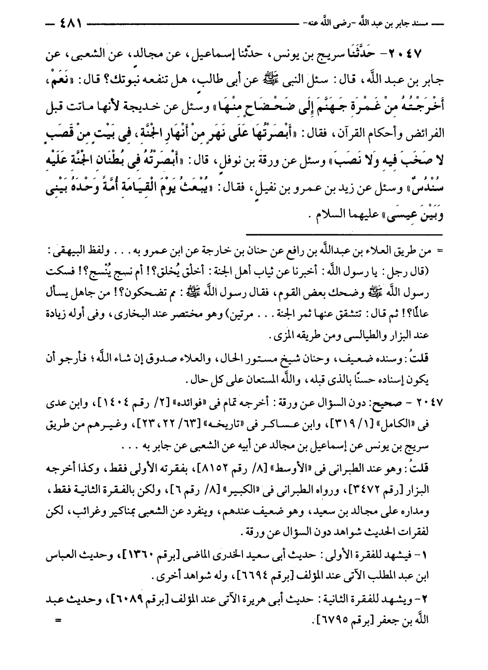 ٢٠٤٧ - حَدَّثَنَا سريج بن يونس، حدّثنا إسماعيل، عن مجالدٍ، عن الشعبى، عن جابر بن عبد الله، قال: سئل النبي - صلى الله عليه وسلم - عن أبى طالب، هل تنفعه نبوتك؟ قال: "نَعَمْ، أَخْرَجْتُهُ مِنْ غَمْرَةِ جَهَنَّمَ إلَى ضَحْضاحٍ مِنْهَا" وسئل عن خديجة لأنها ماتت قبل الفرائض وأحكام القرآن، فقال: "أَبْصَرْتُهَا عَلَى نَهَرٍ مِنْ أَنْهَارِ الجَنَّةِ، في بَيْت مِنْ قَصَب لا صَخَبَ فِيهِ وَلا نَصَبَ" وسئل عن ورقة بن نوفلٍ، قال: "أَبْصَرْتُهُ في بُطْنَانِ الجَنَّةِ عَلَيْهِ سُنْدُسٌ" وسئل عن زيد بن عمرو بن نفيلٍ، فقال: "يُبْعَثُ يَوْمَ الْقِيَامَةِ أُمَّةً وَحْدَهُ بَيْنِى وَبَيْنَ عِيسَى" عليهما السلام.