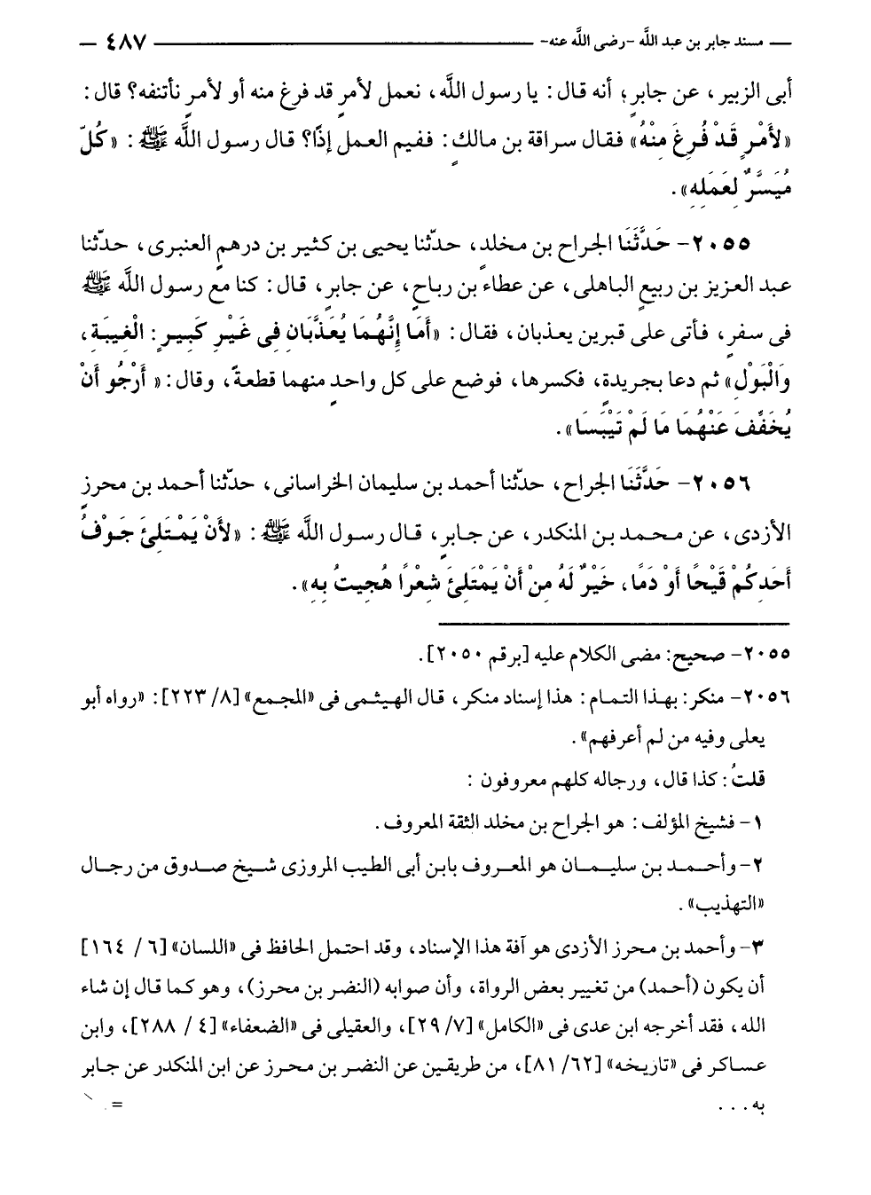 ٢٠٥٥ - حَدَّثَنَا الجراح بن مخلدٍ، حدّثنا يحيى بن كثير بن درهمٍ العنبرى، حدّثنا عبد العزيز بن ربيعٍ الباهلى، عن عطاء بن رباحٍ، عن جابرٍ، قال: كنا مع رسول الله - صلى الله عليه وسلم - في سفرٍ، فأتى على قبرين يعذبان، فقال: "أَمَا إِنَّهمَا يُعَذَّبَانِ فِي غَيْرِ كَبِيرٍ: الْغِيبَةِ، وَالْبَوْلِ" ثم دعا بجريدةٍ، فكسرها، فوضع على كل واحدٍ منهما قطعةً، وقال: "أَرْجُو أَنْ يُخَفِّفَ عَنْهُمَا مَا لَمْ تَيْبَسَا".